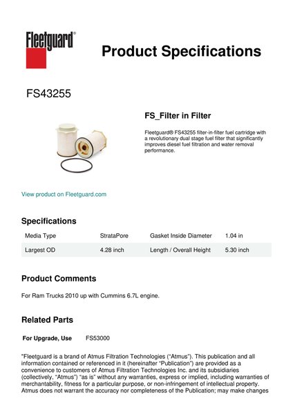 Fleetguard® FS43255 filter-in-filter fuel cartridge with a revolutionary dual stage fuel filter that significantly improves diesel fuel filtration and water removal performance.Specification