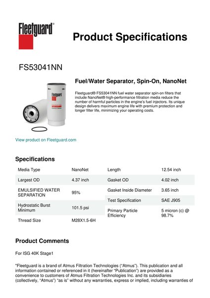 Fleetguard® FS53041NN fuel water separator spin-on filters that include NanoNet® high-performance filtration media reduce the number of harmful particles in the engine’s fuel injectors. Its unique design delivers maximum engine life with premium protection and longer filter life, minimizing your operating costs.Specification