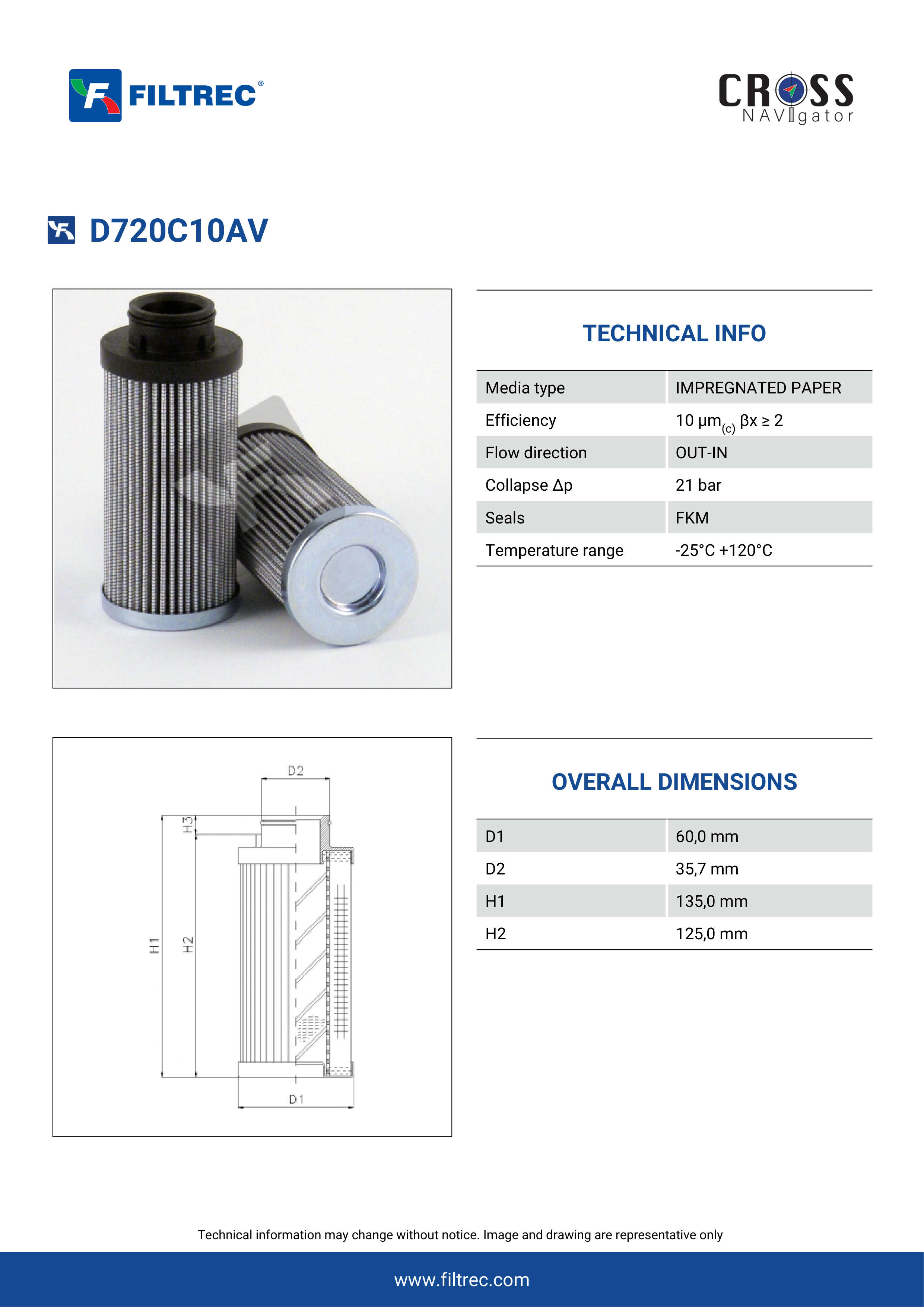 Genuine Filtrec D720C10AV. This Filtrec element is designed to meet or exceed the quality and performance of brand OEM’s ensuring superior filtration performance and long-lasting durability.