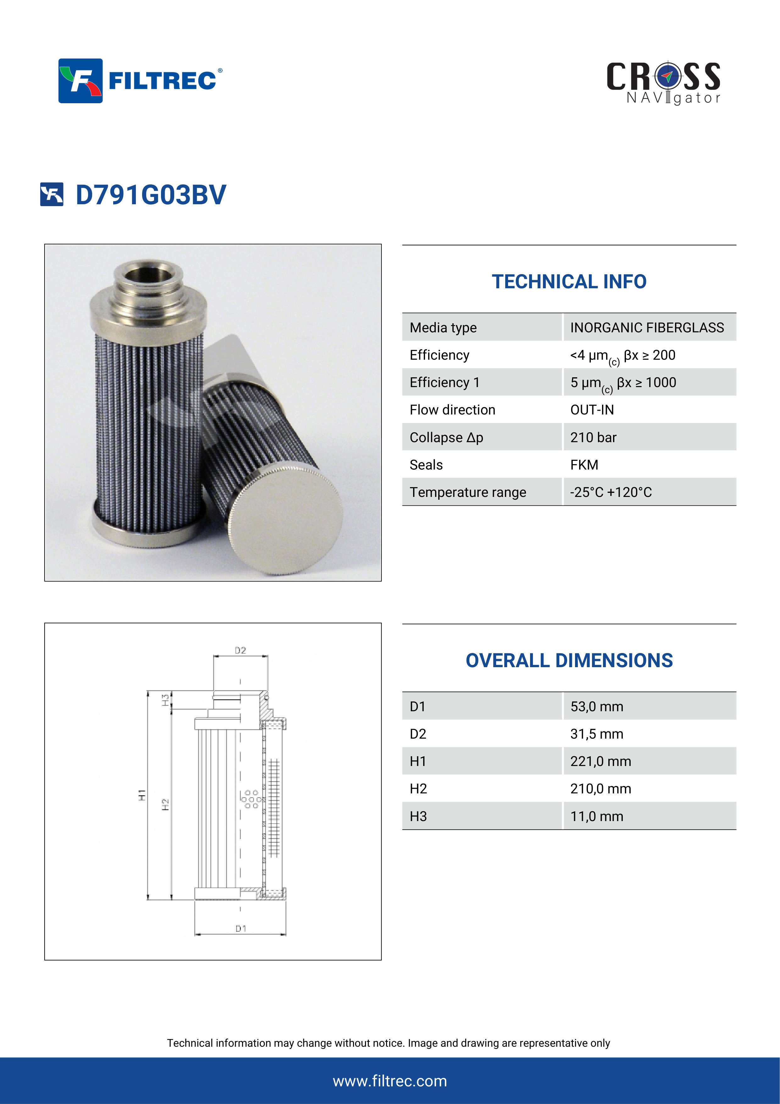 Genuine Filtrec D791G03BV. This Filtrec element is designed to meet or exceed the quality and performance of brand OEM’s ensuring superior filtration performance and long-lasting durability.Engineered with their high performance media and a durable design, the D791G03BV provides reliable and consistent performance over its lifespan, even in harsh operating environments. When you order from FilterFinder, you can trust that you are getting a reliable and high-quality replacement filter that will keep your system running smoothly.