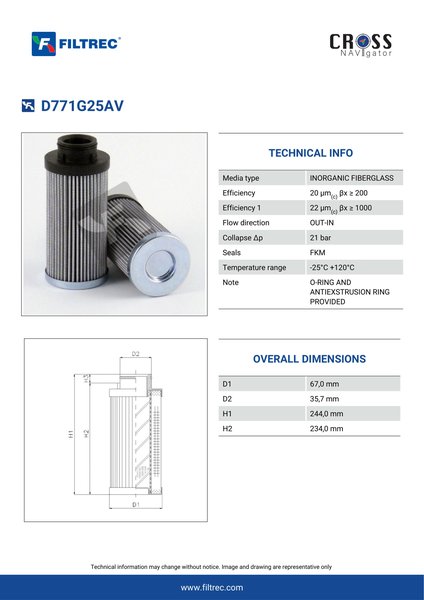 Genuine Filtrec D771G25AV. This Filtrec element is designed to meet or exceed the quality and performance of brand OEM’s ensuring superior filtration performance and long-lasting durability.
