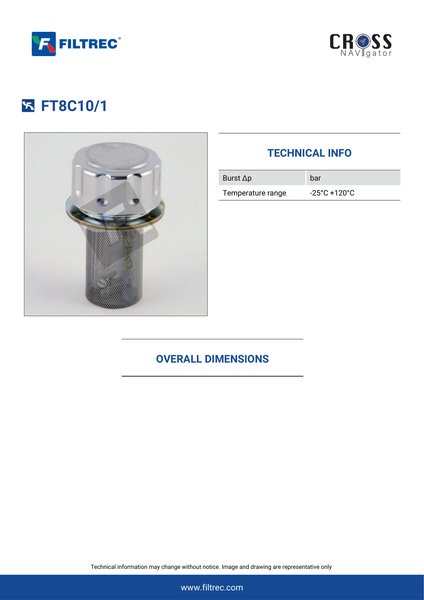 Genuine Filtrec FT8C10/1. This Filtrec element is designed to meet or exceed the quality and performance of brand OEM’s ensuring superior filtration performance and long-lasting durability.