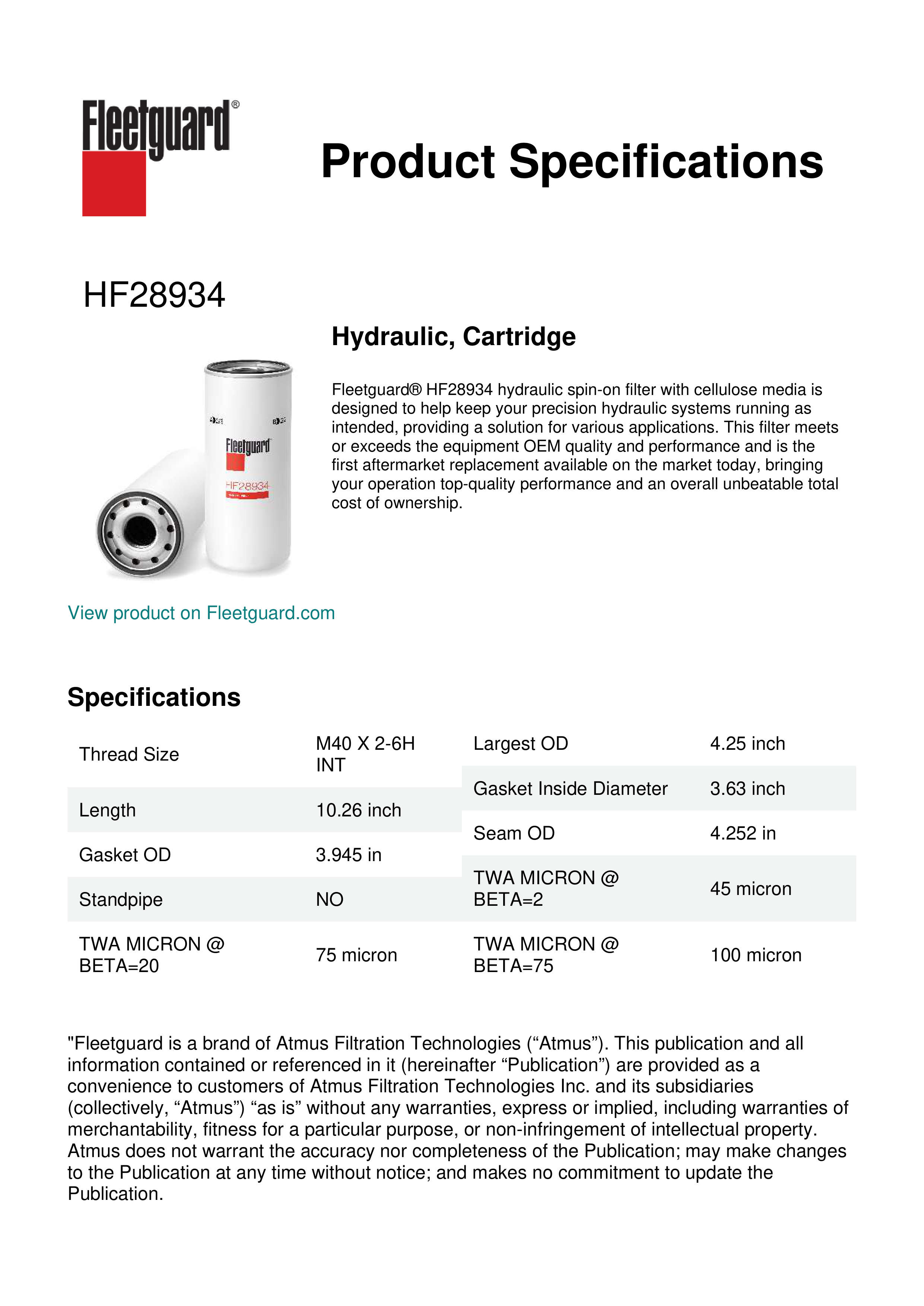 Fleetguard® HF28934 hydraulic spin-on filter with cellulose media is designed to help keep your precision hydraulic systems running as intended, providing a solution for various applications. This filter meets or exceeds the equipment OEM quality and performance and is the first aftermarket replacement available on the market today, bringing your operation top-quality performance and an overall unbeatable total cost of ownership.Specification