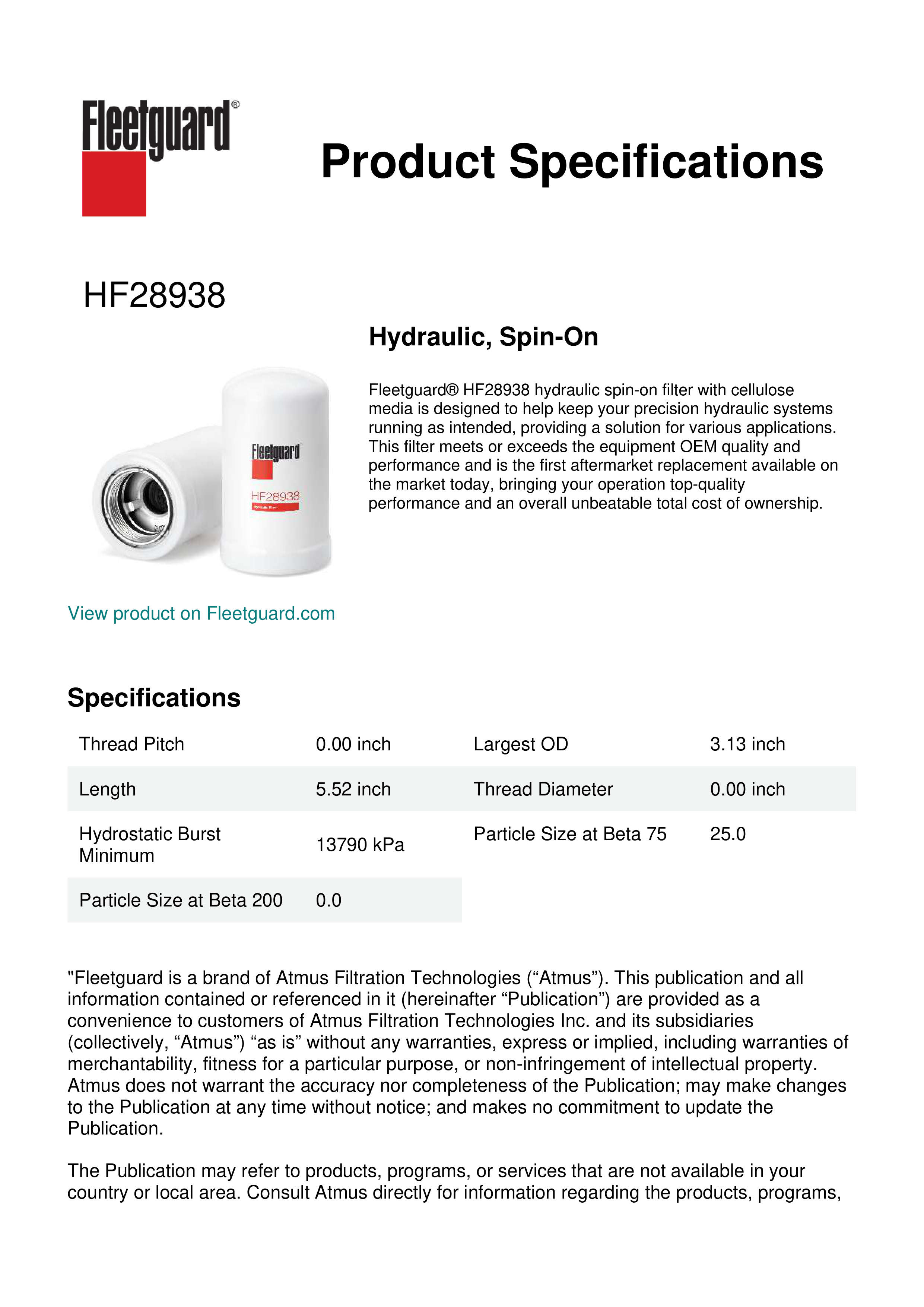Fleetguard® HF28938 hydraulic spin-on filter with cellulose media is designed to help keep your precision hydraulic systems running as intended, providing a solution for various applications. This filter meets or exceeds the equipment OEM quality and performance and is the first aftermarket replacement available on the market today, bringing your operation top-quality performance and an overall unbeatable total cost of ownership.Specification