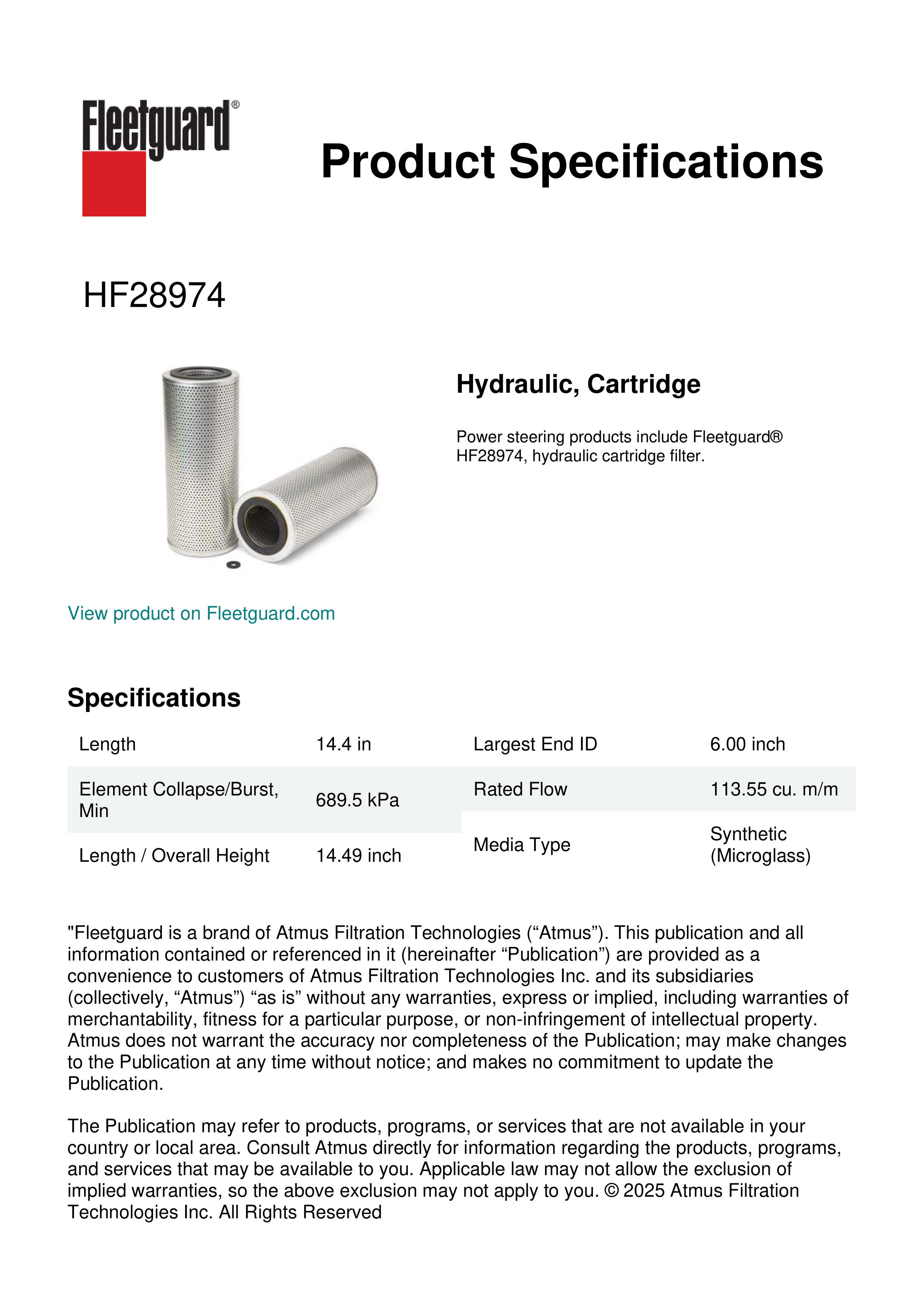 Power steering products include Fleetguard® HF28974, hydraulic cartridge filter.Specification