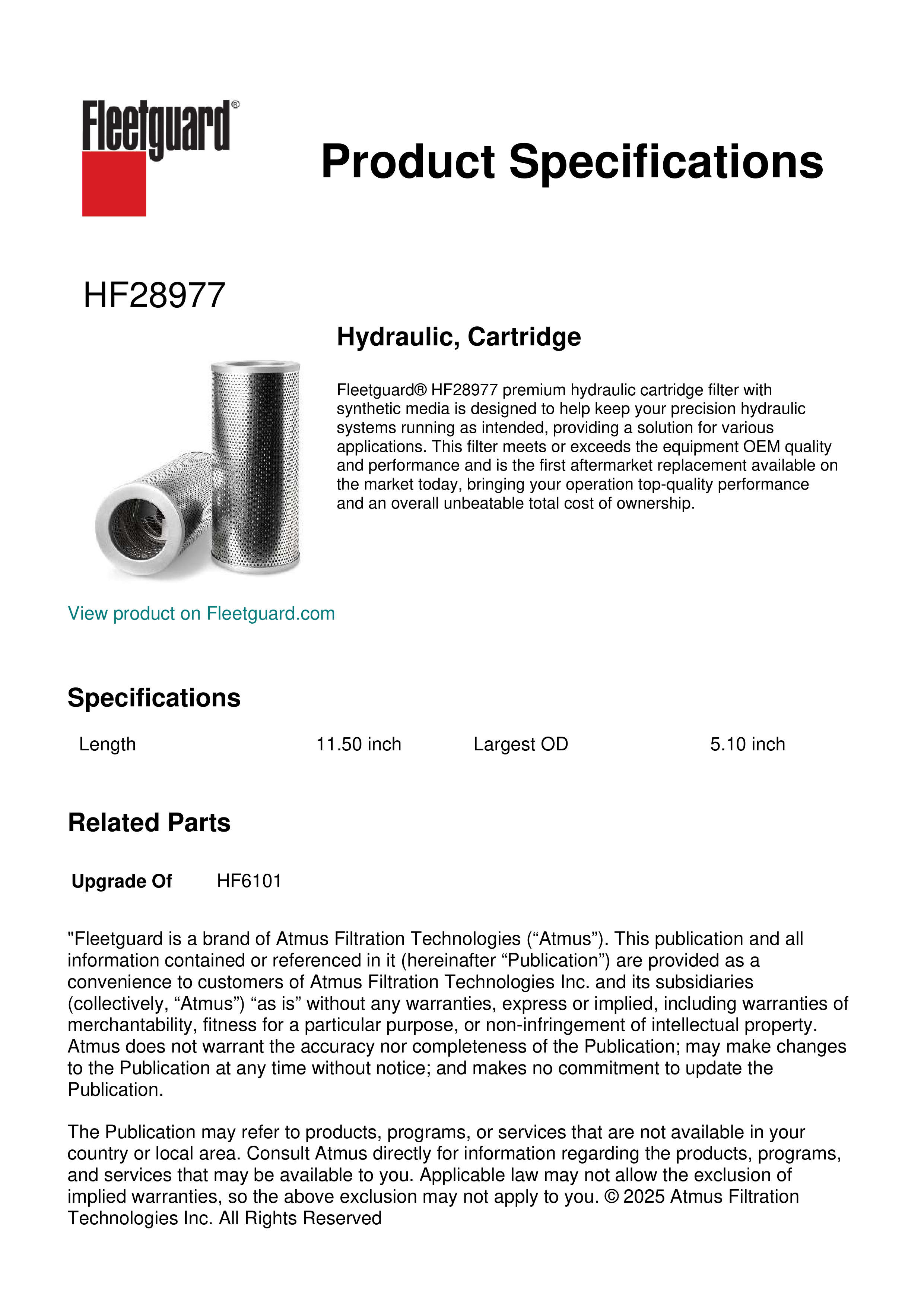 Fleetguard® HF28977 premium hydraulic cartridge filter with synthetic media is designed to help keep your precision hydraulic systems running as intended, providing a solution for various applications. This filter meets or exceeds the equipment OEM quality and performance and is the first aftermarket replacement available on the market today, bringing your operation top-quality performance and an overall unbeatable total cost of ownership.Specification