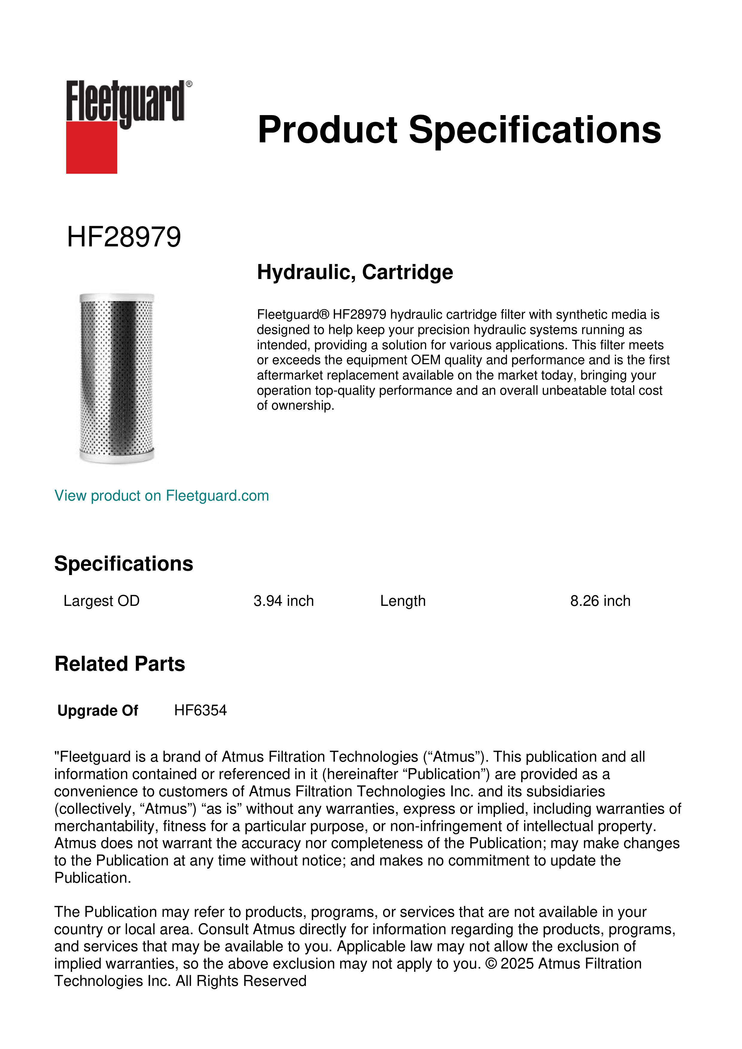 Fleetguard® HF28979 hydraulic cartridge filter with synthetic media is designed to help keep your precision hydraulic systems running as intended, providing a solution for various applications. This filter meets or exceeds the equipment OEM quality and performance and is the first aftermarket replacement available on the market today, bringing your operation top-quality performance and an overall unbeatable total cost of ownership.Specification