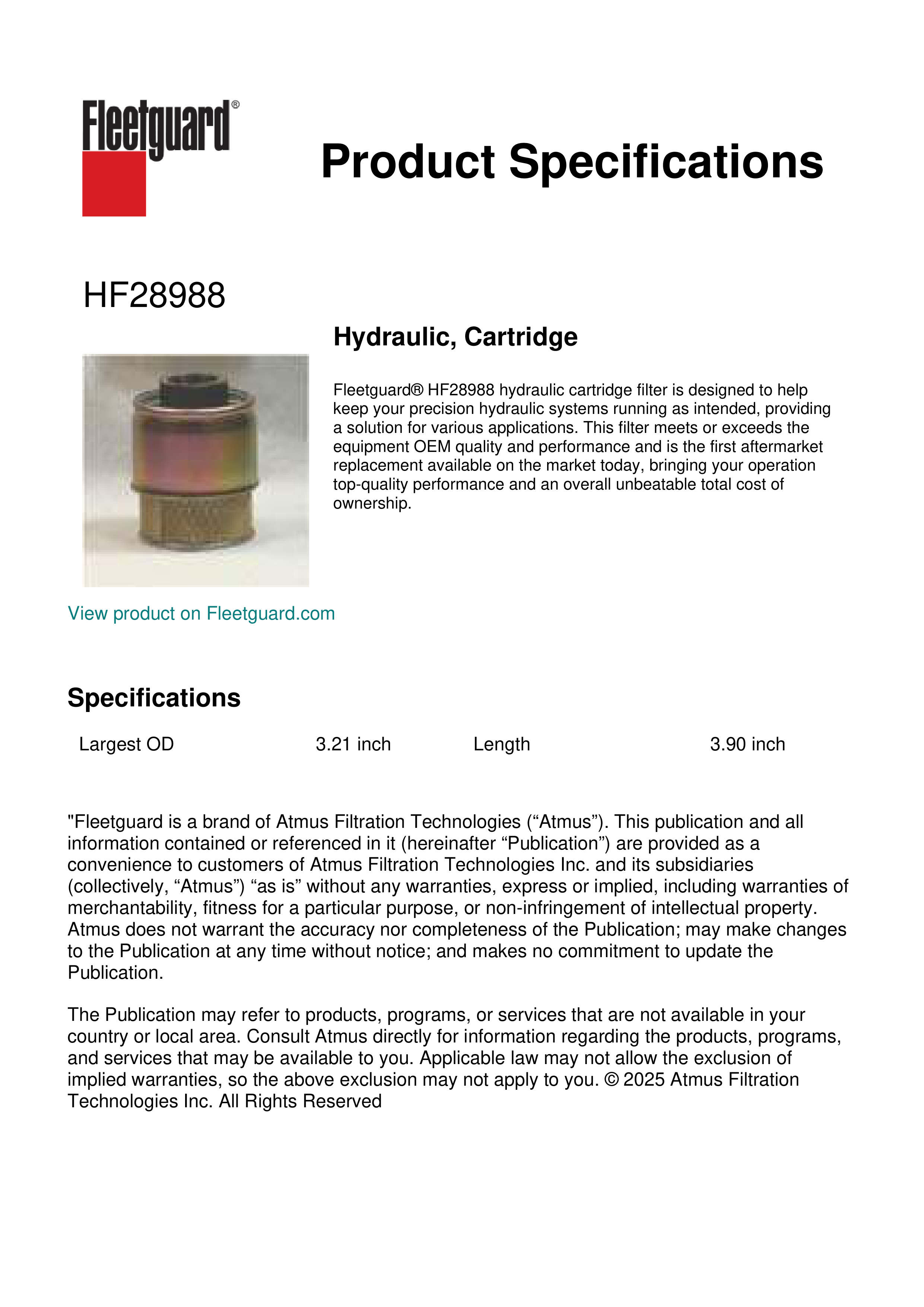 Fleetguard® HF28988 hydraulic cartridge filter is designed to help keep your precision hydraulic systems running as intended, providing a solution for various applications. This filter meets or exceeds the equipment OEM quality and performance and is the first aftermarket replacement available on the market today, bringing your operation top-quality performance and an overall unbeatable total cost of ownership.