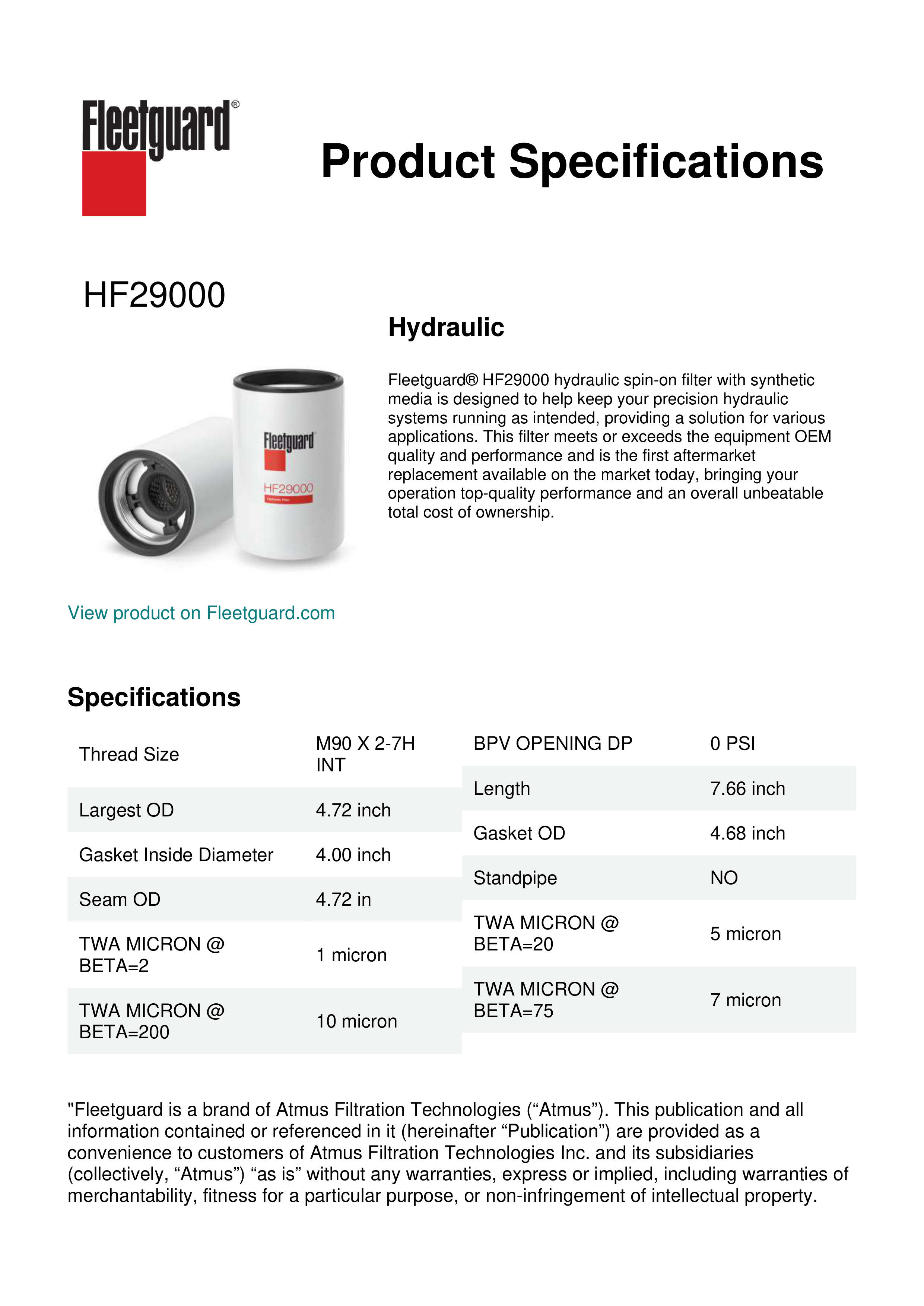 Fleetguard® HF29000 hydraulic spin-on filter with synthetic media is designed to help keep your precision hydraulic systems running as intended, providing a solution for various applications. This filter meets or exceeds the equipment OEM quality and performance and is the first aftermarket replacement available on the market today, bringing your operation top-quality performance and an overall unbeatable total cost of ownership.Specification