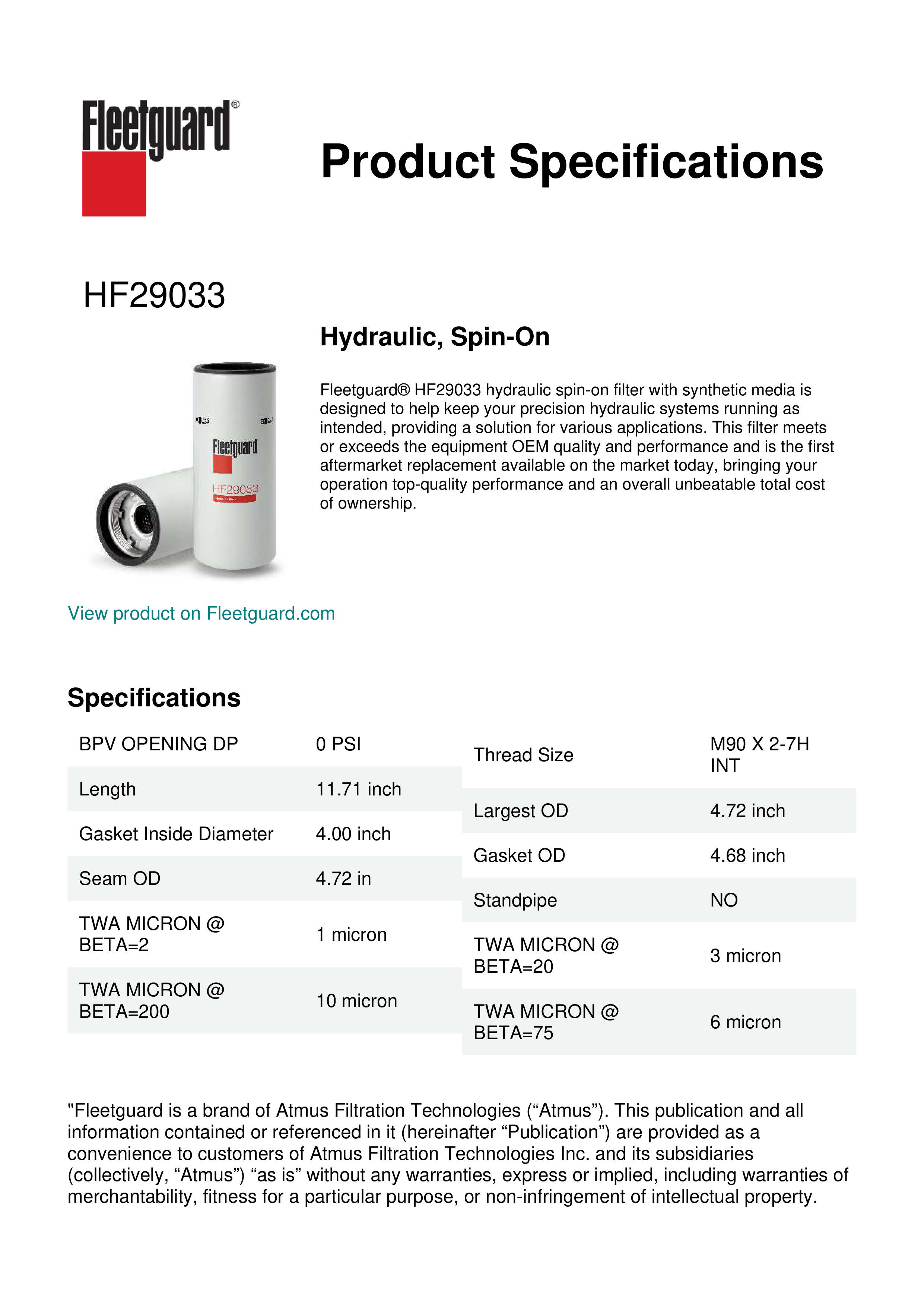 Fleetguard® HF29033 hydraulic spin-on filter with synthetic media is designed to help keep your precision hydraulic systems running as intended, providing a solution for various applications. This filter meets or exceeds the equipment OEM quality and performance and is the first aftermarket replacement available on the market today, bringing your operation top-quality performance and an overall unbeatable total cost of ownership.Specification
