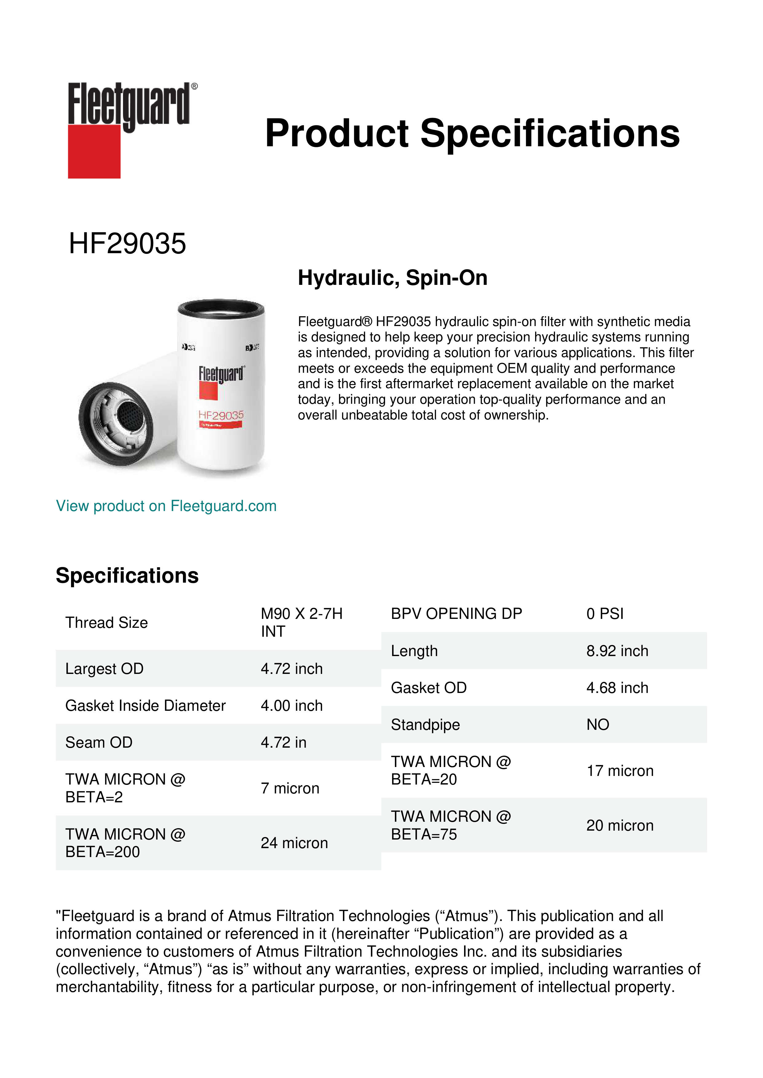 Fleetguard® HF29035 hydraulic spin-on filter with synthetic media is designed to help keep your precision hydraulic systems running as intended, providing a solution for various applications. This filter meets or exceeds the equipment OEM quality and performance and is the first aftermarket replacement available on the market today, bringing your operation top-quality performance and an overall unbeatable total cost of ownership.Specification