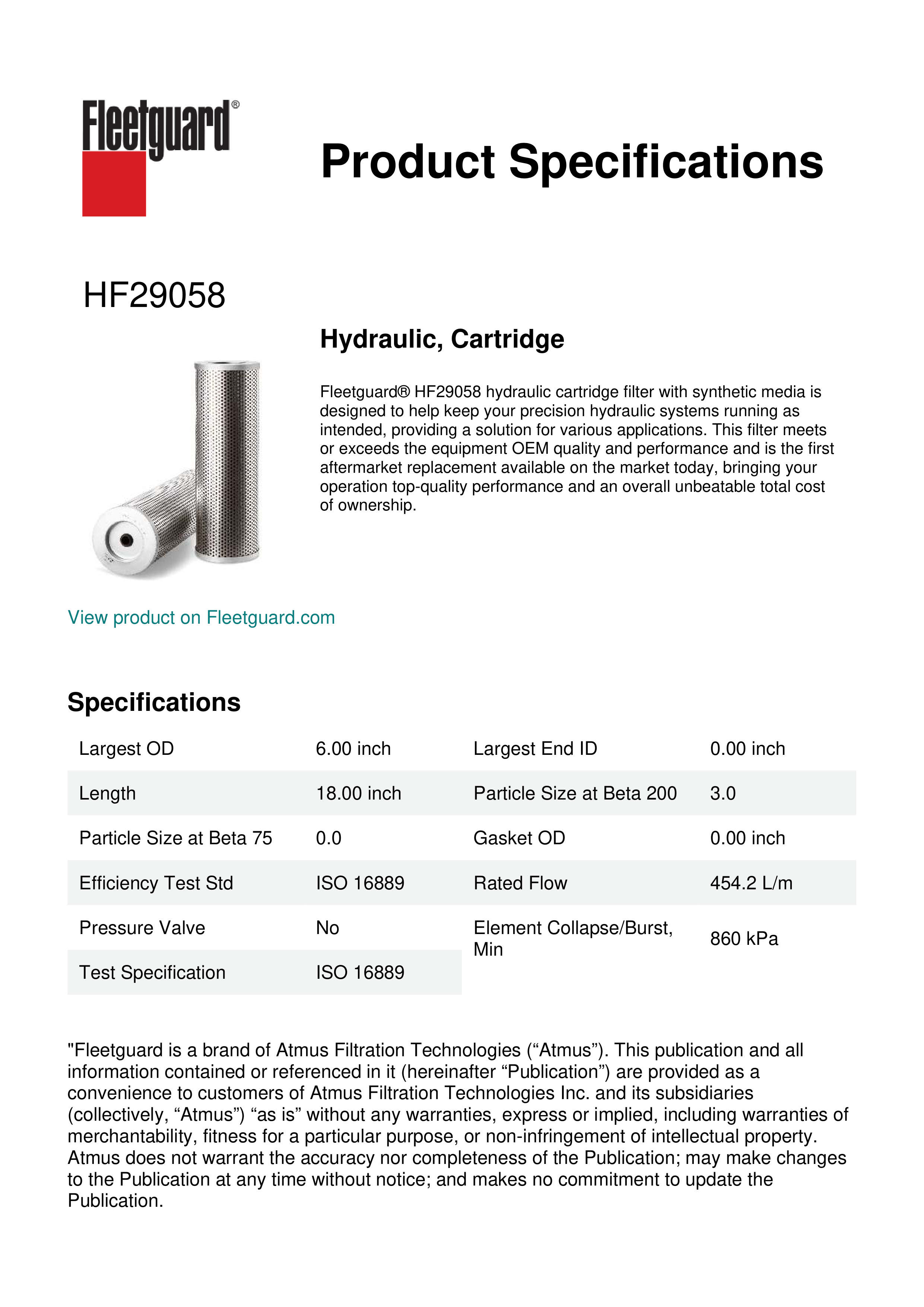 Fleetguard® HF29058 hydraulic cartridge filter with synthetic media is designed to help keep your precision hydraulic systems running as intended, providing a solution for various applications. This filter meets or exceeds the equipment OEM quality and performance and is the first aftermarket replacement available on the market today, bringing your operation top-quality performance and an overall unbeatable total cost of ownership.Specification