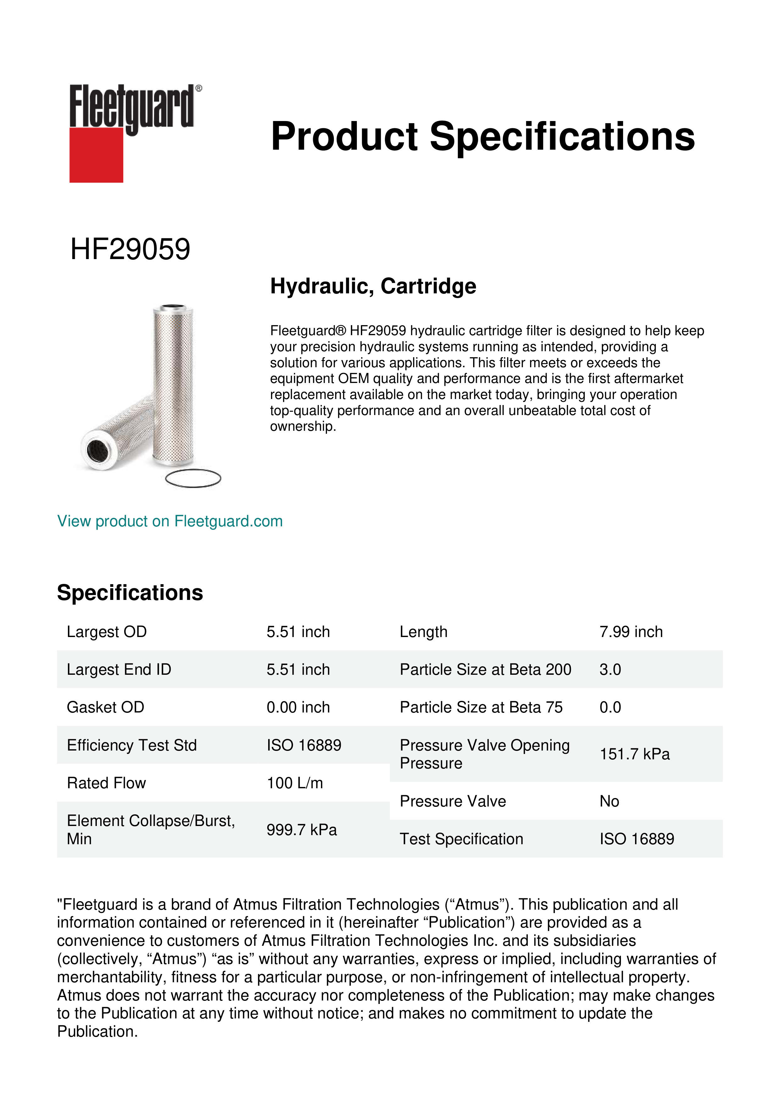 Fleetguard® HF29059 hydraulic cartridge filter is designed to help keep your precision hydraulic systems running as intended, providing a solution for various applications. This filter meets or exceeds the equipment OEM quality and performance and is the first aftermarket replacement available on the market today, bringing your operation top-quality performance and an overall unbeatable total cost of ownership.Specification