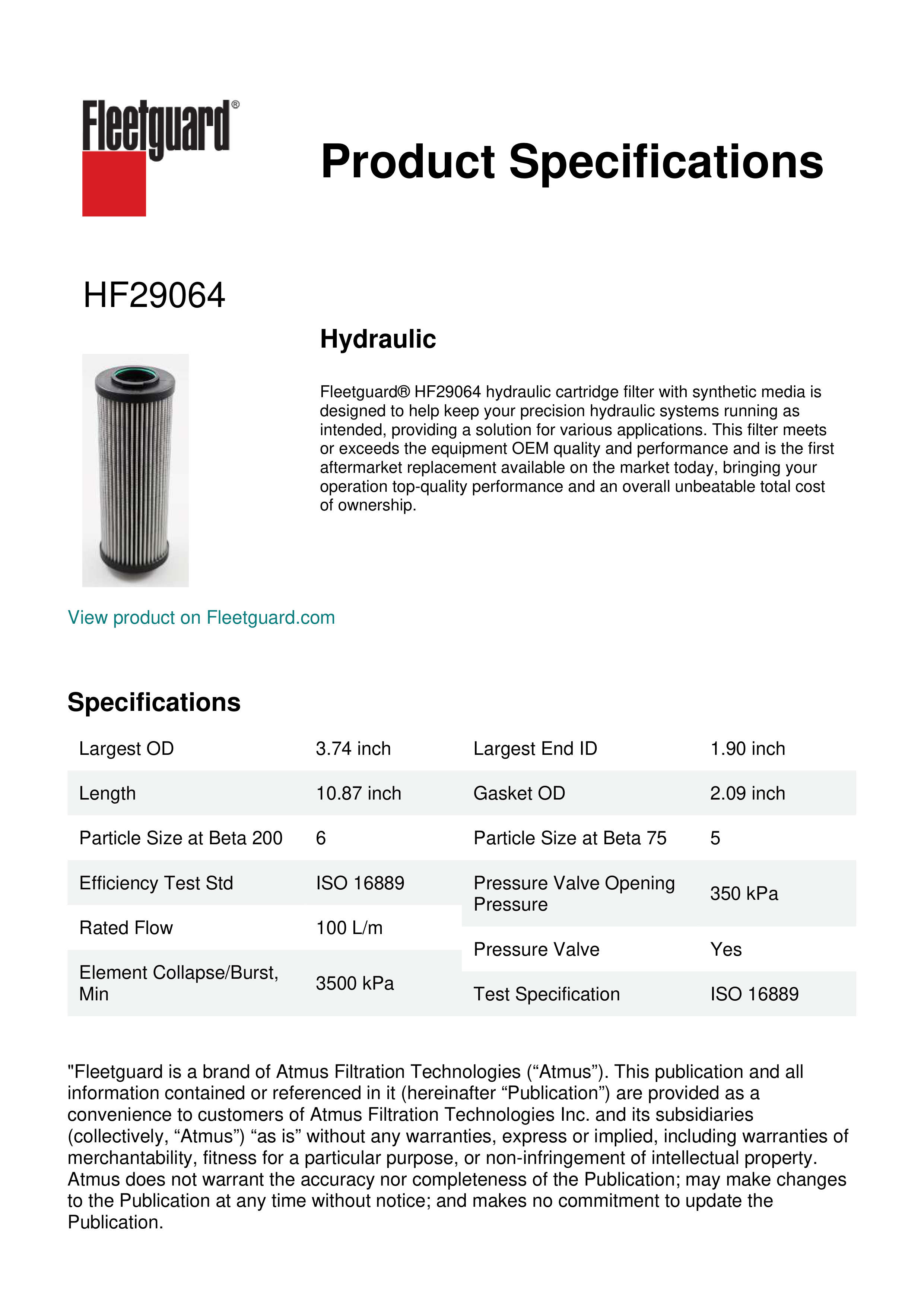 Fleetguard® HF29064 hydraulic cartridge filter with synthetic media is designed to help keep your precision hydraulic systems running as intended, providing a solution for various applications. This filter meets or exceeds the equipment OEM quality and performance and is the first aftermarket replacement available on the market today, bringing your operation top-quality performance and an overall unbeatable total cost of ownership.Specification