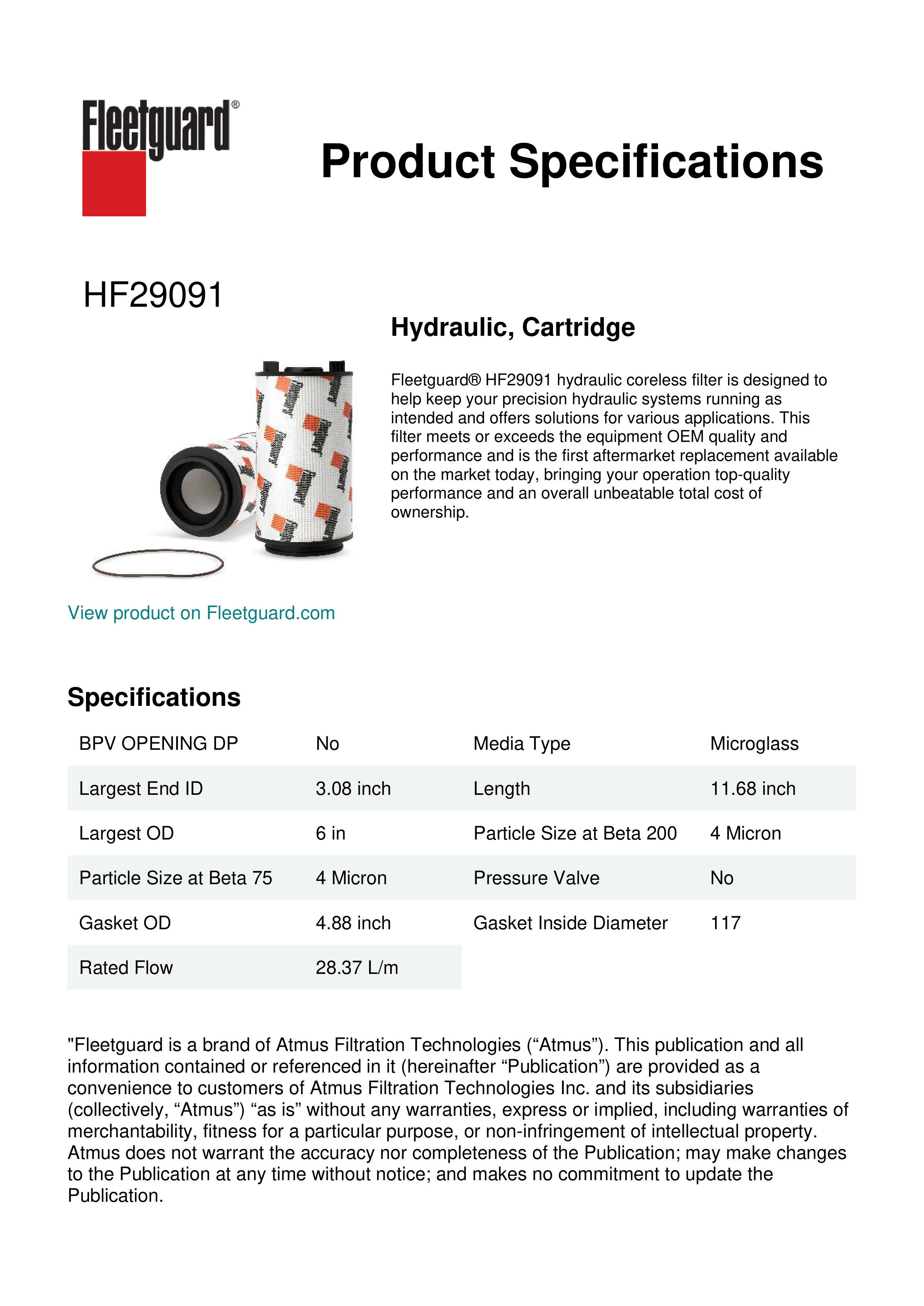 Fleetguard® HF29091 hydraulic coreless filter is designed to help keep your precision hydraulic systems running as intended and offers solutions for various applications. This filter meets or exceeds the equipment OEM quality and performance and is the first aftermarket replacement available on the market today, bringing your operation top-quality performance and an overall unbeatable total cost of ownership.Specification