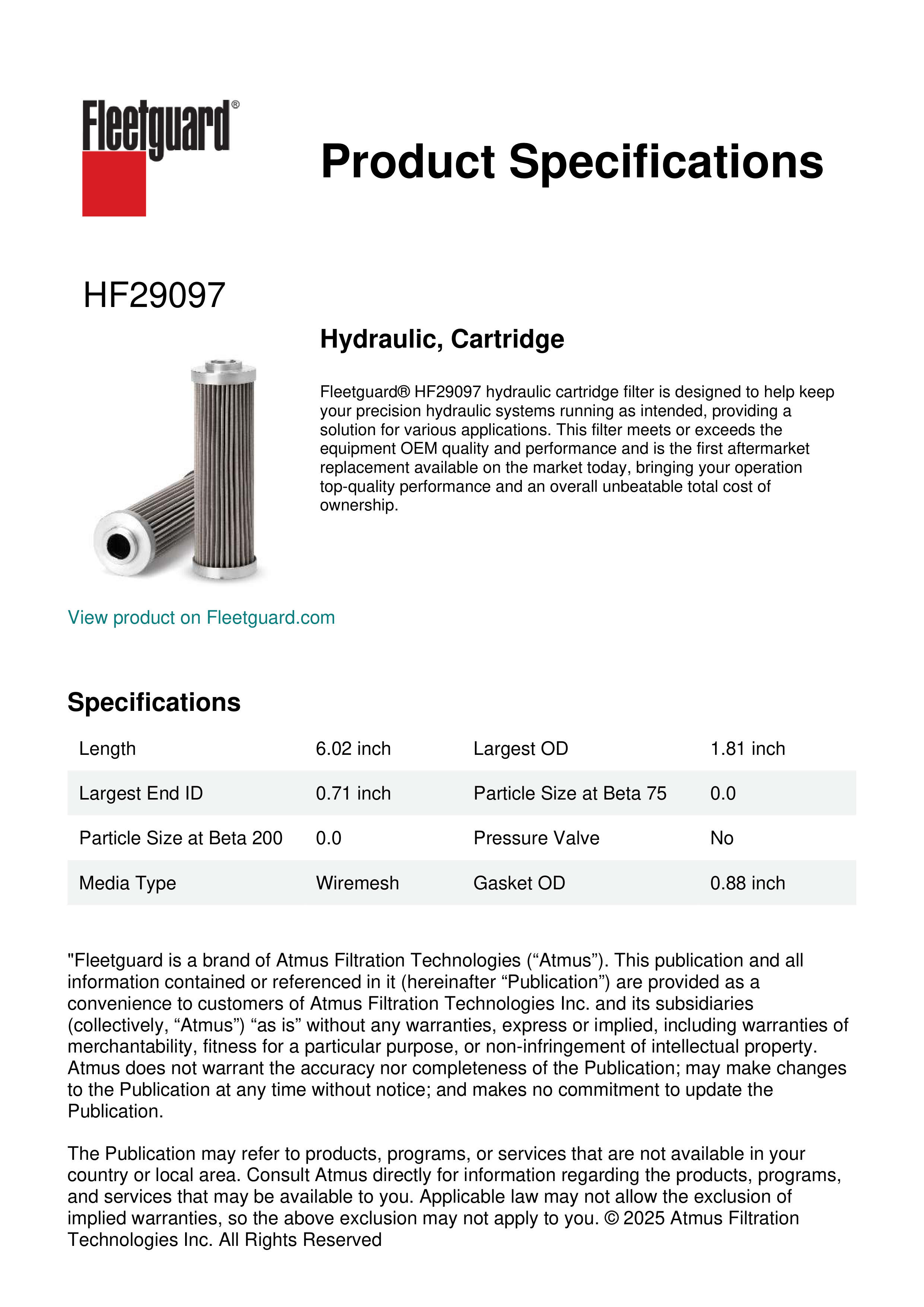 Fleetguard® HF29097 hydraulic cartridge filter is designed to help keep your precision hydraulic systems running as intended, providing a solution for various applications. This filter meets or exceeds the equipment OEM quality and performance and is the first aftermarket replacement available on the market today, bringing your operation top-quality performance and an overall unbeatable total cost of ownership.Specification