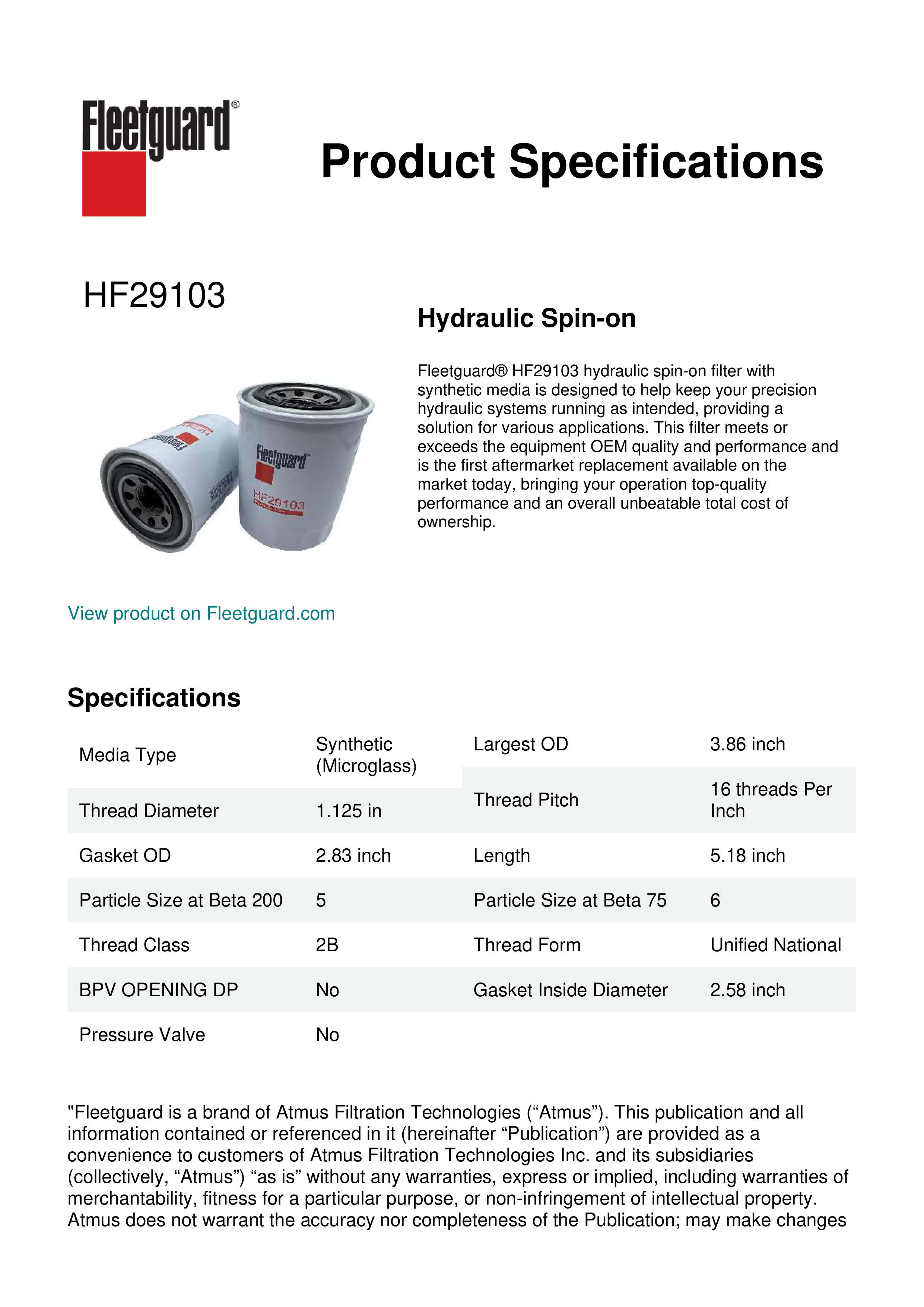 Fleetguard® HF29103 hydraulic spin-on filter with synthetic media is designed to help keep your precision hydraulic systems running as intended, providing a solution for various applications. This filter meets or exceeds the equipment OEM quality and performance and is the first aftermarket replacement available on the market today, bringing your operation top-quality performance and an overall unbeatable total cost of ownership.Specification