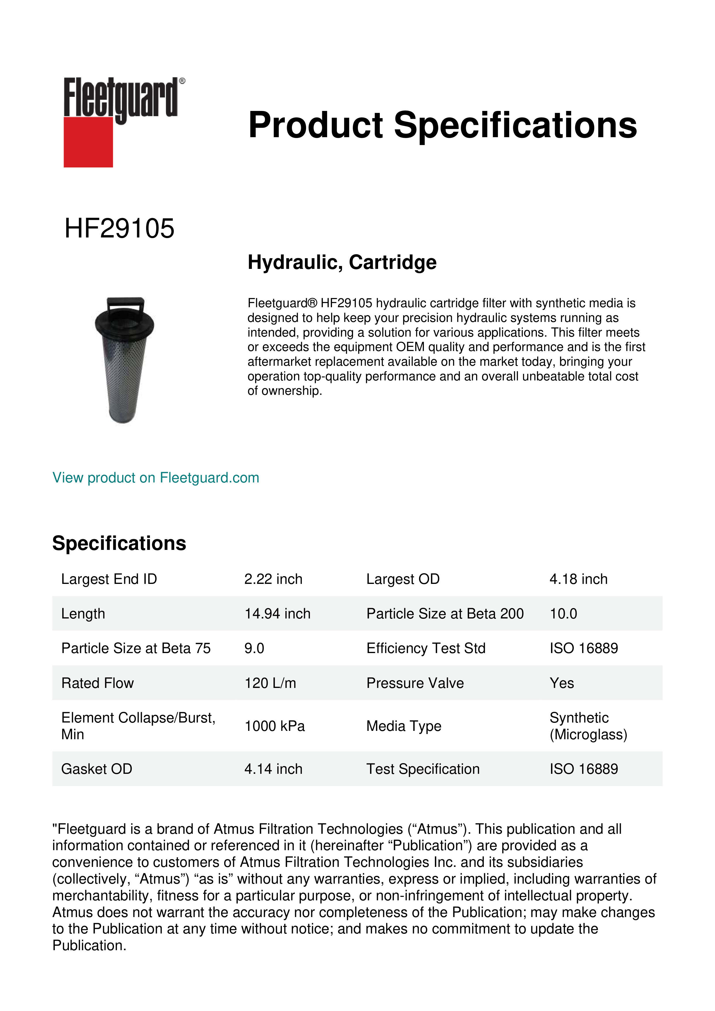 Fleetguard® HF29105 hydraulic cartridge filter with synthetic media is designed to help keep your precision hydraulic systems running as intended, providing a solution for various applications. This filter meets or exceeds the equipment OEM quality and performance and is the first aftermarket replacement available on the market today, bringing your operation top-quality performance and an overall unbeatable total cost of ownership.Specification