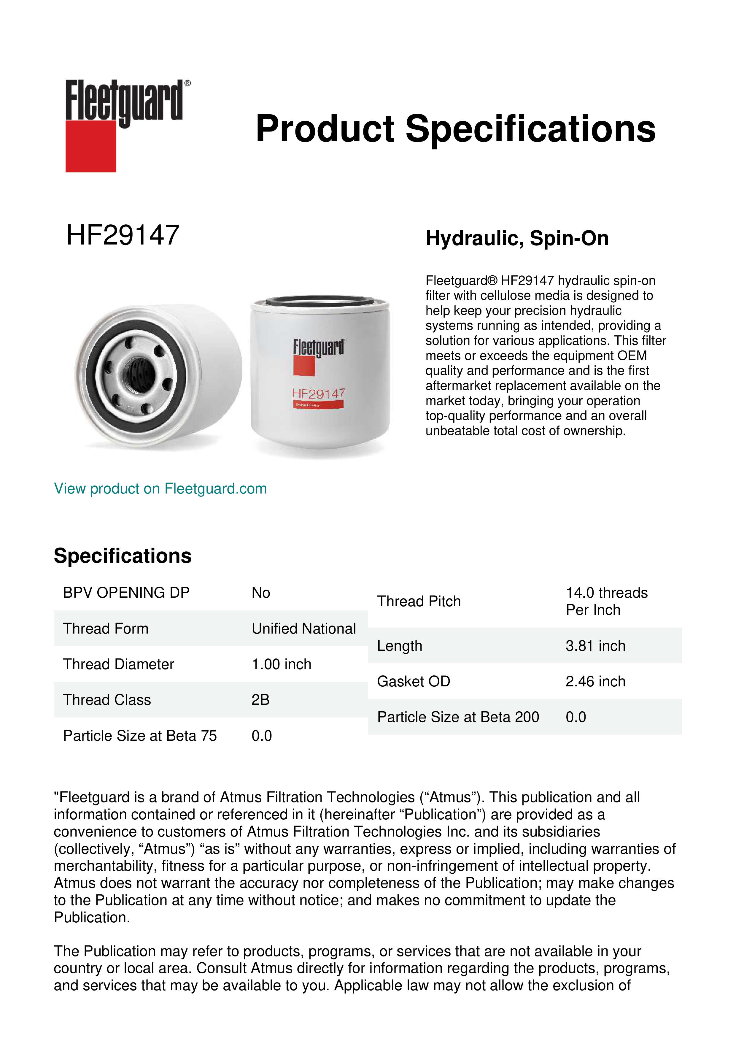 Fleetguard® HF29147 hydraulic spin-on filter with cellulose media is designed to help keep your precision hydraulic systems running as intended, providing a solution for various applications. This filter meets or exceeds the equipment OEM quality and performance and is the first aftermarket replacement available on the market today, bringing your operation top-quality performance and an overall unbeatable total cost of ownership.Specification