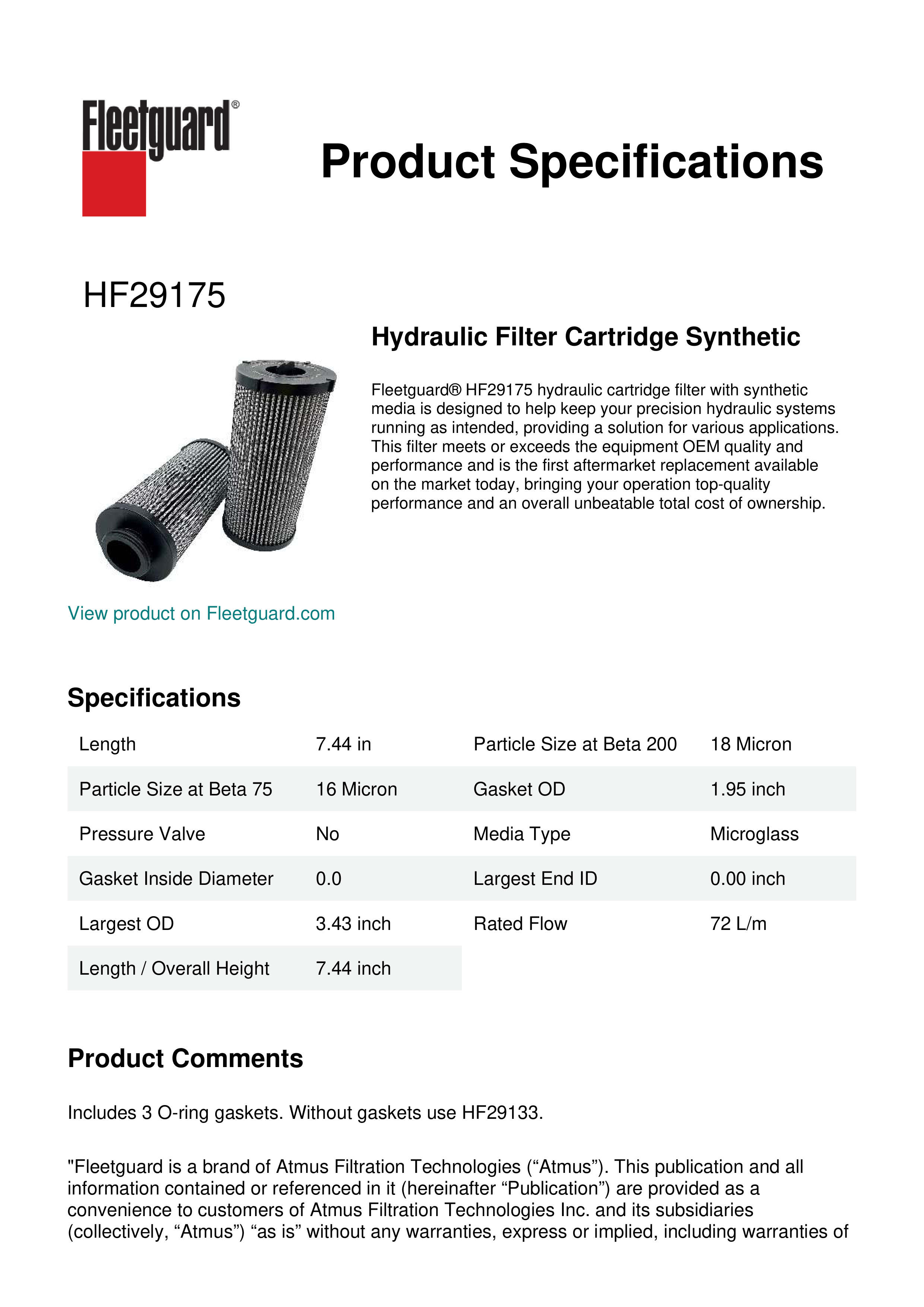 Fleetguard® HF29175 hydraulic cartridge filter with synthetic media is designed to help keep your precision hydraulic systems running as intended, providing a solution for various applications. This filter meets or exceeds the equipment OEM quality and performance and is the first aftermarket replacement available on the market today, bringing your operation top-quality performance and an overall unbeatable total cost of ownership.Specification