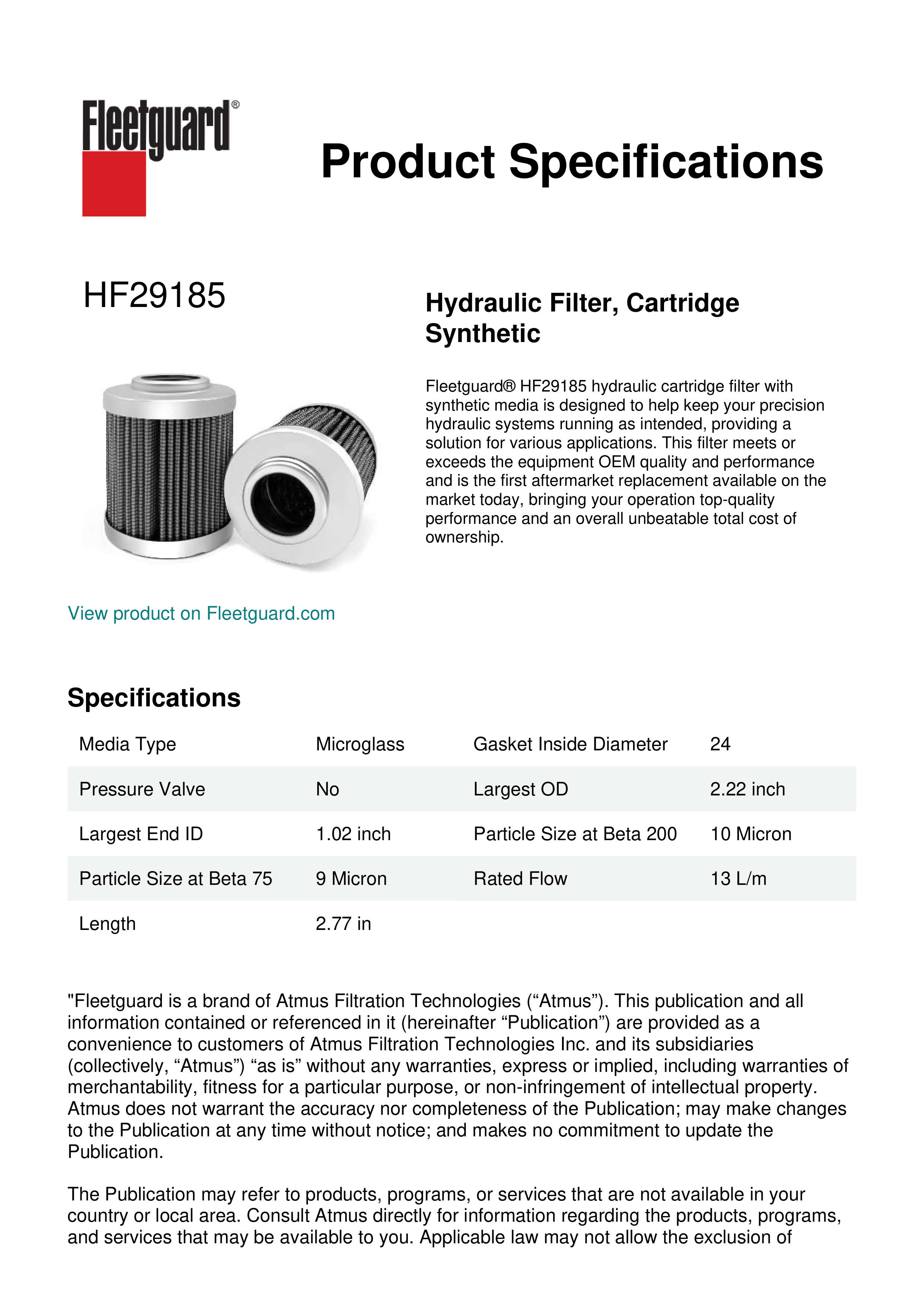 Fleetguard® HF29185 hydraulic cartridge filter with synthetic media is designed to help keep your precision hydraulic systems running as intended, providing a solution for various applications. This filter meets or exceeds the equipment OEM quality and performance and is the first aftermarket replacement available on the market today, bringing your operation top-quality performance and an overall unbeatable total cost of ownership.Specification