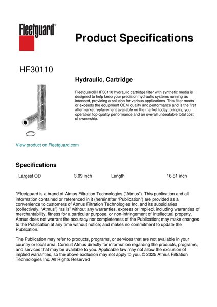 Fleetguard® HF30110 hydraulic cartridge filter with synthetic media is designed to help keep your precision hydraulic systems running as intended, providing a solution for various applications. This filter meets or exceeds the equipment OEM quality and performance and is the first aftermarket replacement available on the market today, bringing your operation top-quality performance and an overall unbeatable total cost of ownership.Specification