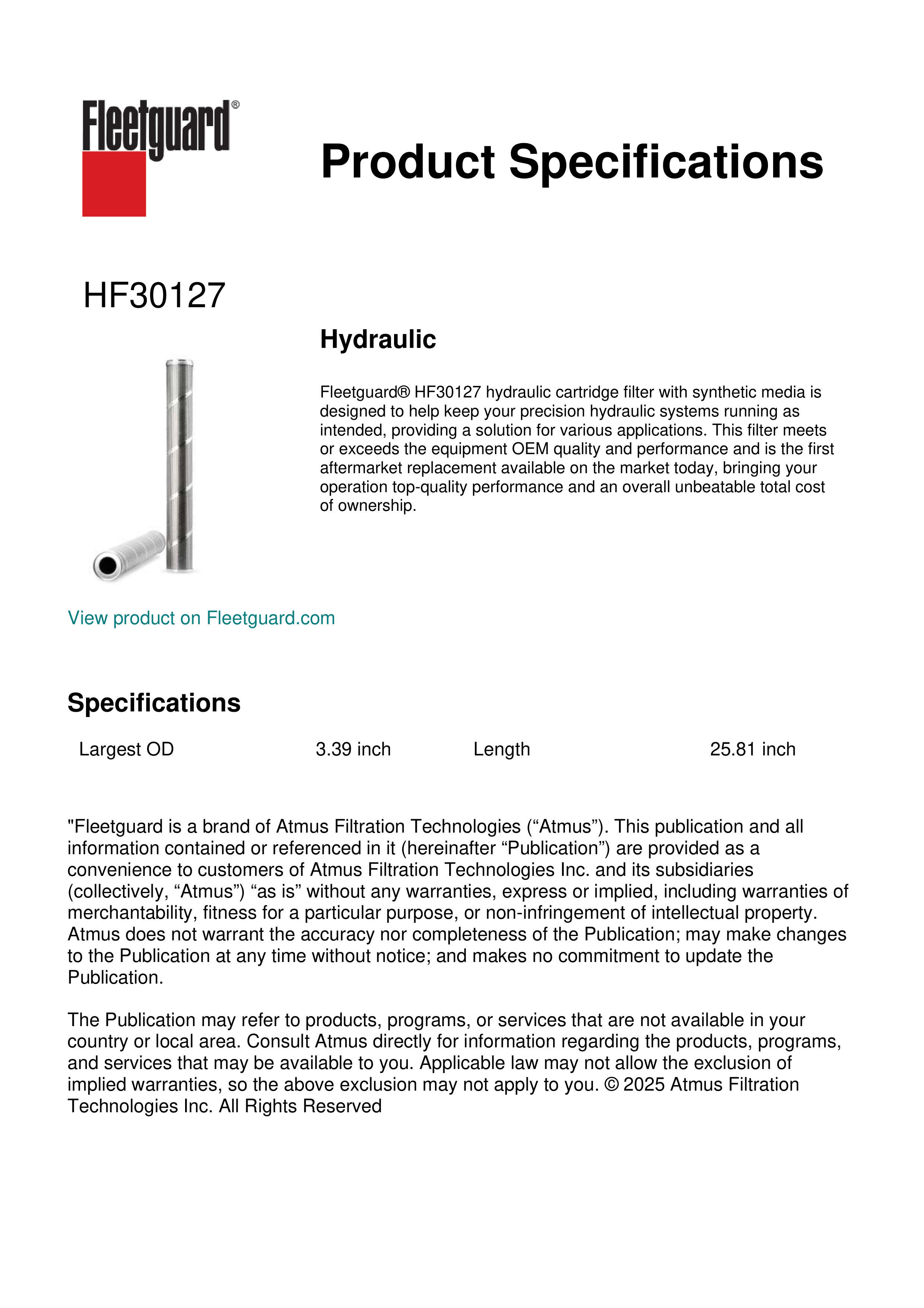 Fleetguard® HF30127 hydraulic cartridge filter with synthetic media is designed to help keep your precision hydraulic systems running as intended, providing a solution for various applications. This filter meets or exceeds the equipment OEM quality and performance and is the first aftermarket replacement available on the market today, bringing your operation top-quality performance and an overall unbeatable total cost of ownership.Specification