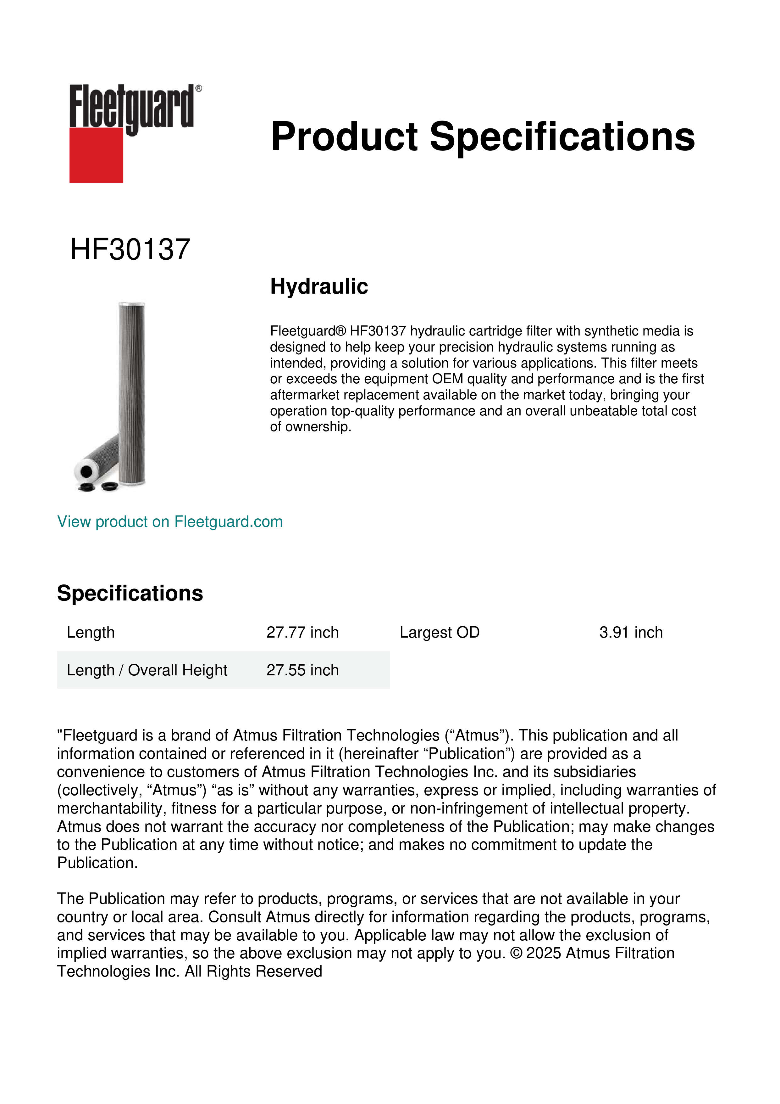 Fleetguard® HF30137 hydraulic cartridge filter with synthetic media is designed to help keep your precision hydraulic systems running as intended, providing a solution for various applications. This filter meets or exceeds the equipment OEM quality and performance and is the first aftermarket replacement available on the market today, bringing your operation top-quality performance and an overall unbeatable total cost of ownership.Specification
