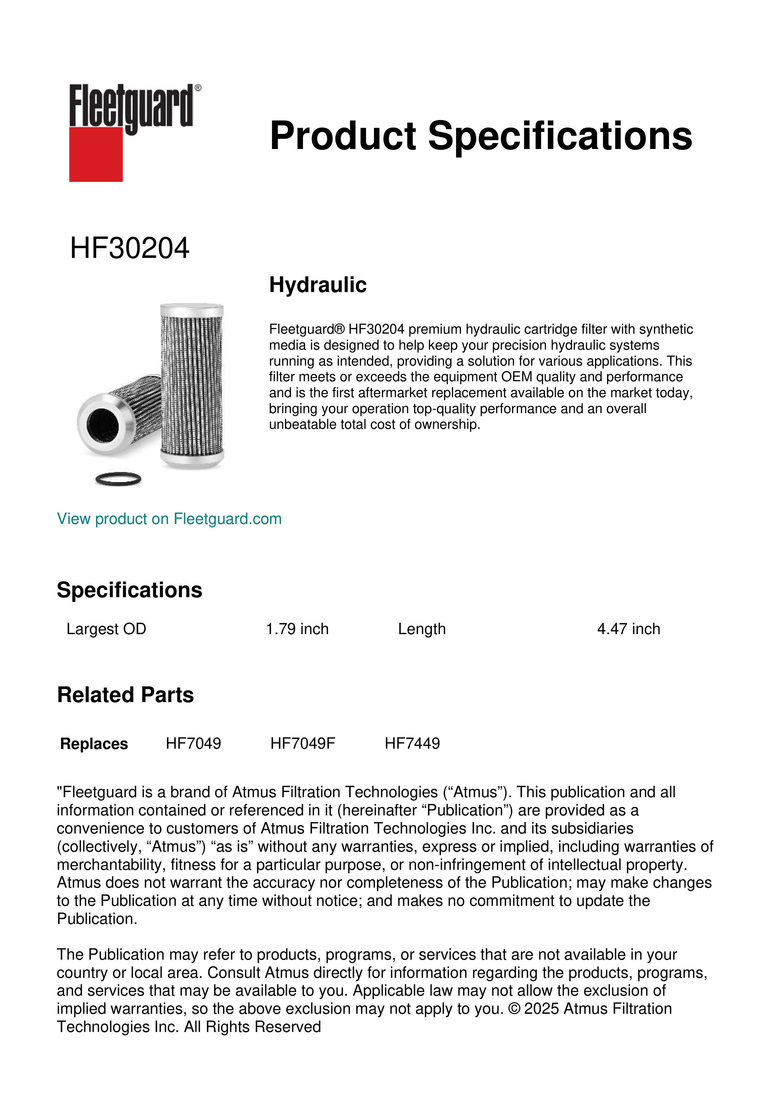 Fleetguard® HF30204 premium hydraulic cartridge filter with synthetic media is designed to help keep your precision hydraulic systems running as intended, providing a solution for various applications. This filter meets or exceeds the equipment OEM quality and performance and is the first aftermarket replacement available on the market today, bringing your operation top-quality performance and an overall unbeatable total cost of ownership.Specification