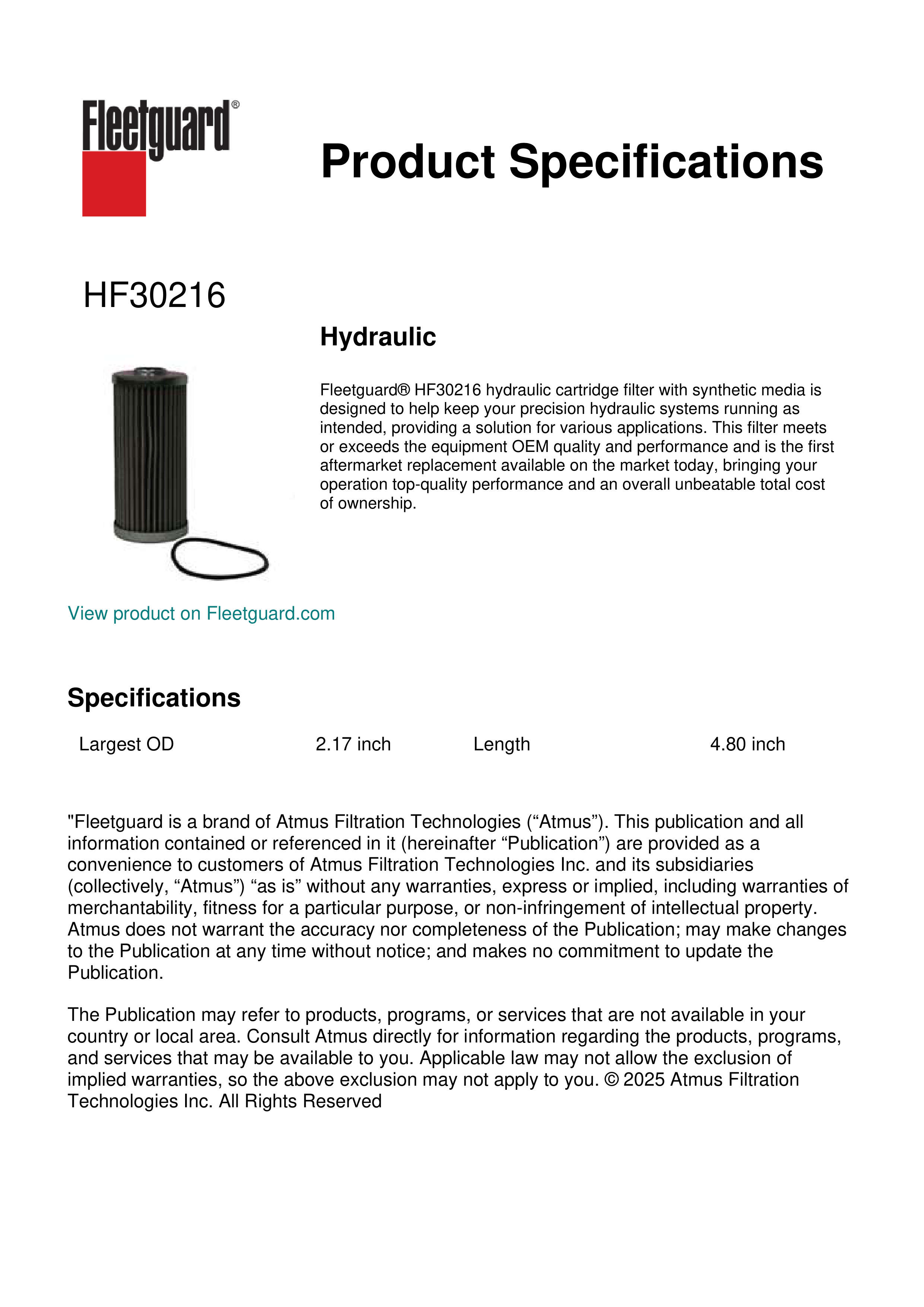 Fleetguard® HF30216 hydraulic cartridge filter with synthetic media is designed to help keep your precision hydraulic systems running as intended, providing a solution for various applications. This filter meets or exceeds the equipment OEM quality and performance and is the first aftermarket replacement available on the market today, bringing your operation top-quality performance and an overall unbeatable total cost of ownership.Specification