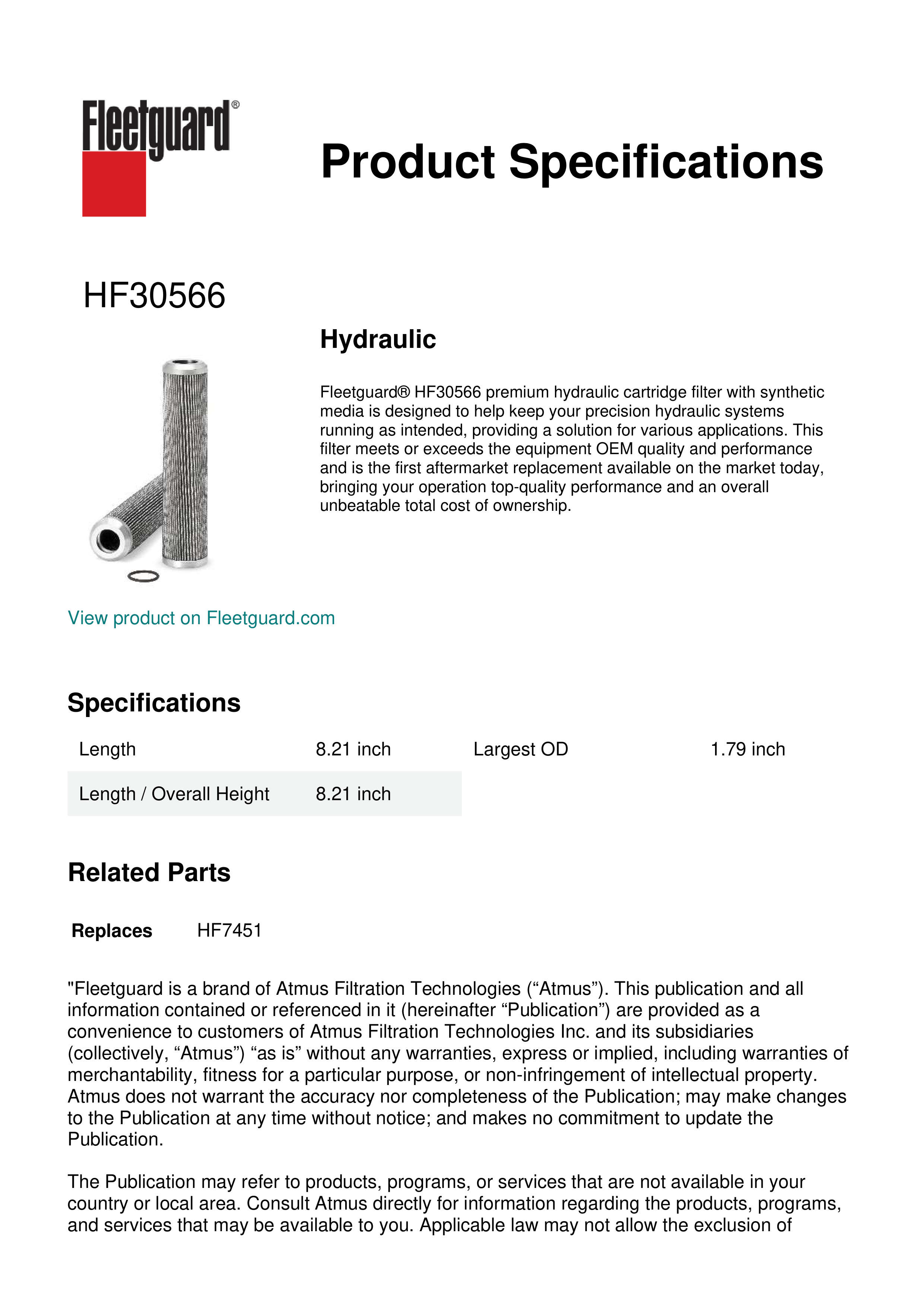 Fleetguard® HF30566 premium hydraulic cartridge filter with synthetic media is designed to help keep your precision hydraulic systems running as intended, providing a solution for various applications. This filter meets or exceeds the equipment OEM quality and performance and is the first aftermarket replacement available on the market today, bringing your operation top-quality performance and an overall unbeatable total cost of ownership.Specification