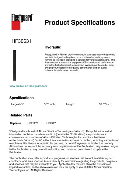 Fleetguard® HF30631 premium hydraulic cartridge filter with synthetic media is designed to help keep your precision hydraulic systems running as intended, providing a solution for various applications. This filter meets or exceeds the equipment OEM quality and performance and is the first aftermarket replacement available on the market today, bringing your operation top-quality performance and an overall unbeatable total cost of ownership.Specification