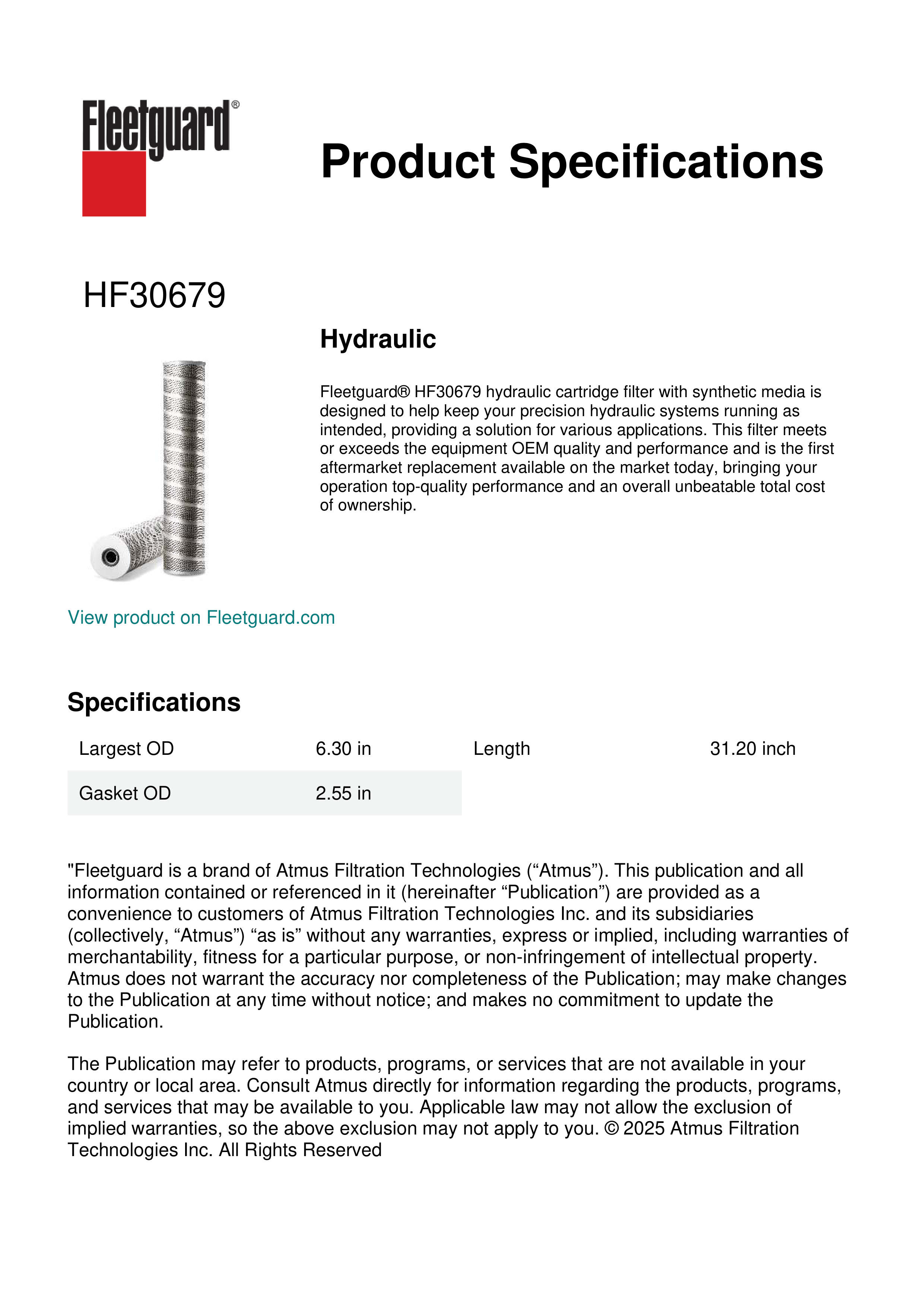 Fleetguard® HF30679 hydraulic cartridge filter with synthetic media is designed to help keep your precision hydraulic systems running as intended, providing a solution for various applications. This filter meets or exceeds the equipment OEM quality and performance and is the first aftermarket replacement available on the market today, bringing your operation top-quality performance and an overall unbeatable total cost of ownership.Specification