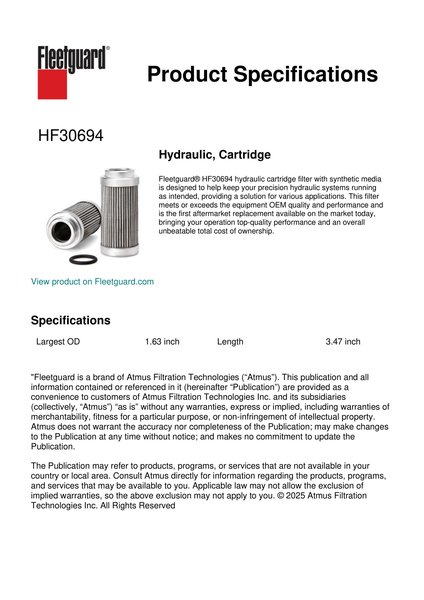 Fleetguard® HF30694 hydraulic cartridge filter with synthetic media is designed to help keep your precision hydraulic systems running as intended, providing a solution for various applications. This filter meets or exceeds the equipment OEM quality and performance and is the first aftermarket replacement available on the market today, bringing your operation top-quality performance and an overall unbeatable total cost of ownership.Specification