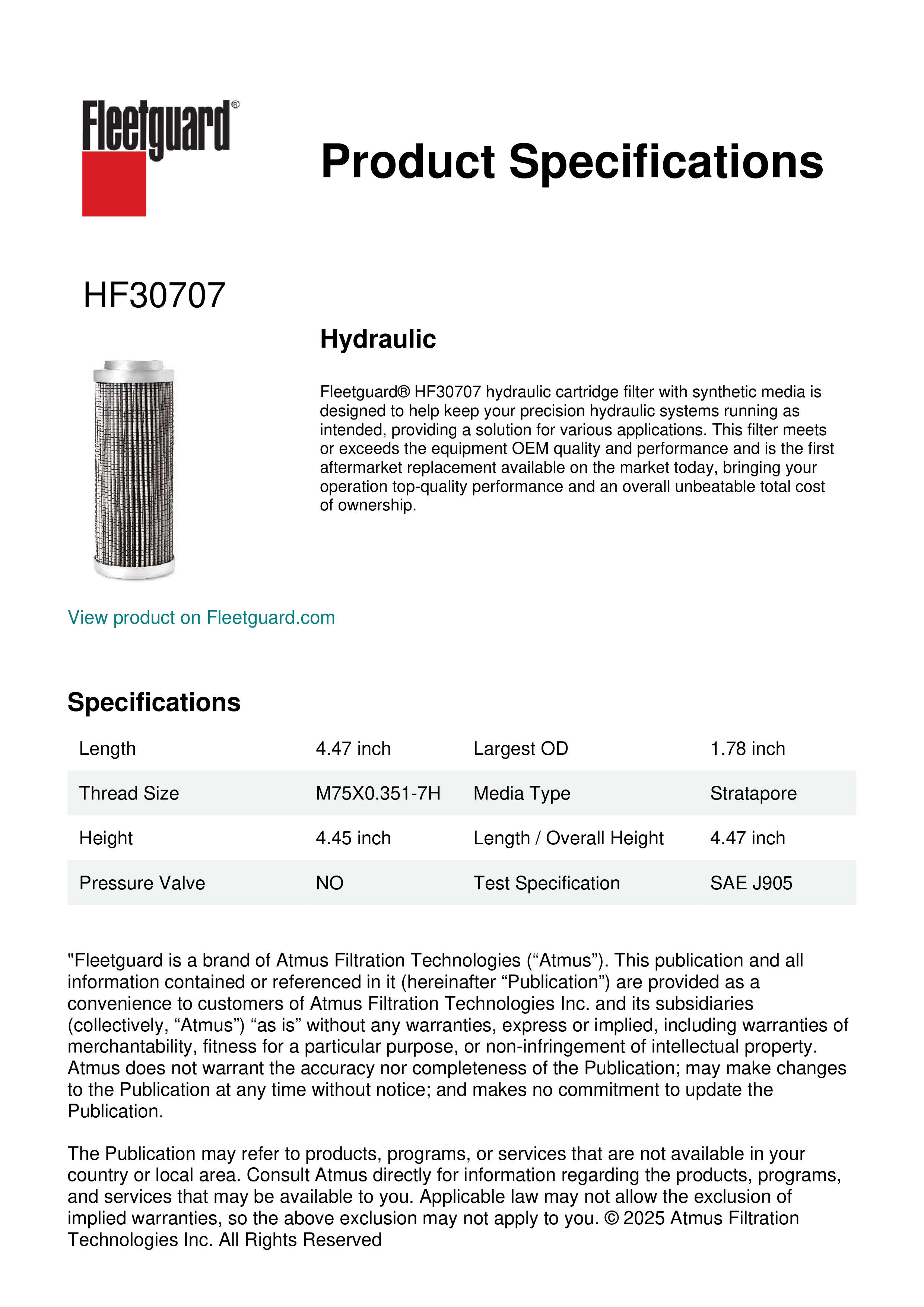 Fleetguard® HF30707 hydraulic cartridge filter with synthetic media is designed to help keep your precision hydraulic systems running as intended, providing a solution for various applications. This filter meets or exceeds the equipment OEM quality and performance and is the first aftermarket replacement available on the market today, bringing your operation top-quality performance and an overall unbeatable total cost of ownership.Specification
