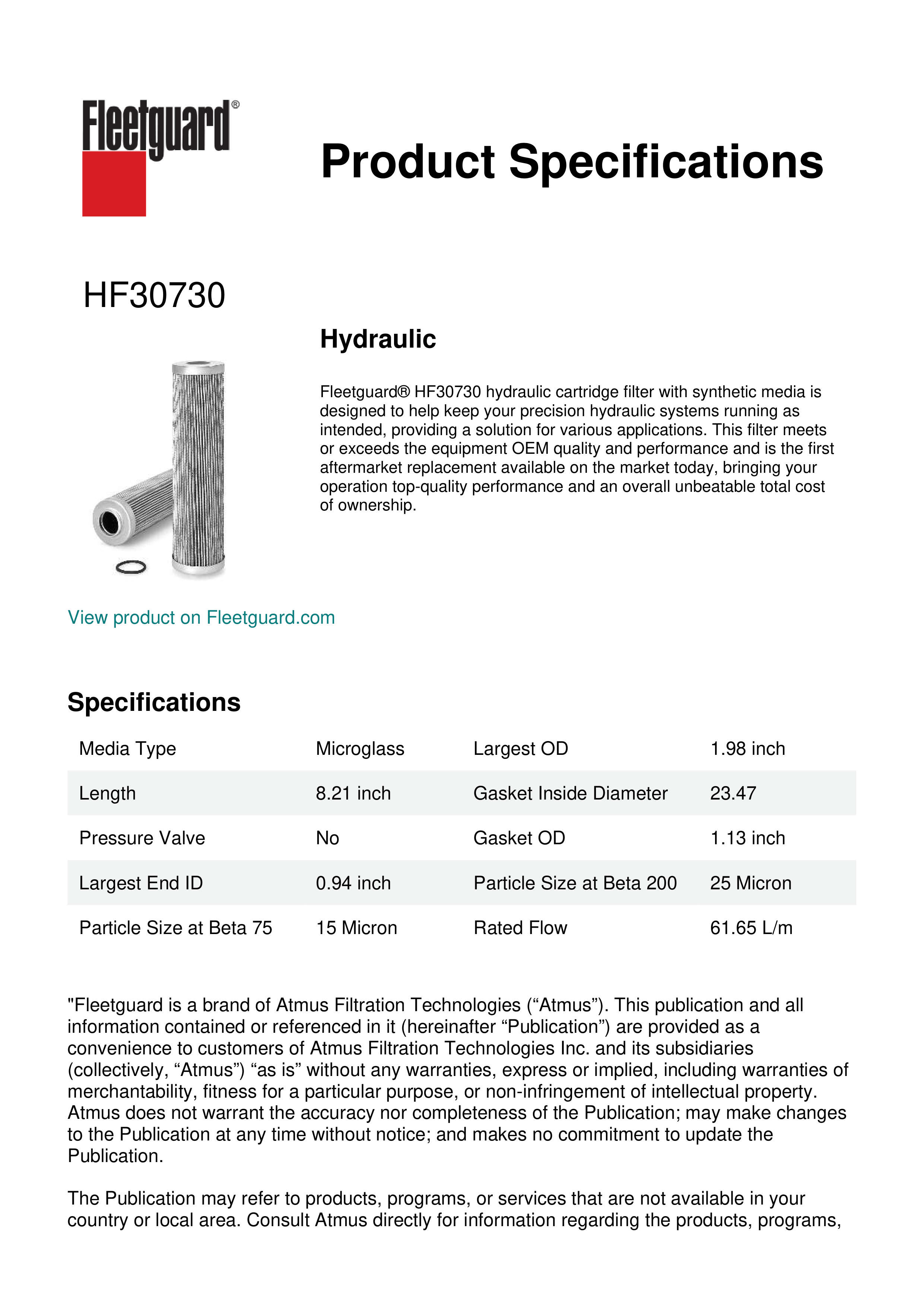 Fleetguard® HF30730 hydraulic cartridge filter with synthetic media is designed to help keep your precision hydraulic systems running as intended, providing a solution for various applications. This filter meets or exceeds the equipment OEM quality and performance and is the first aftermarket replacement available on the market today, bringing your operation top-quality performance and an overall unbeatable total cost of ownership.Specification