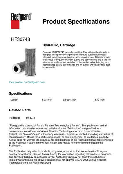 Fleetguard® HF30748 hydraulic cartridge filter with synthetic media is designed to help keep your precision hydraulic systems running as intended, providing a solution for various applications. This filter meets or exceeds the equipment OEM quality and performance and is the first aftermarket replacement available on the market today, bringing your operation top-quality performance and an overall unbeatable total cost of ownership.Specification