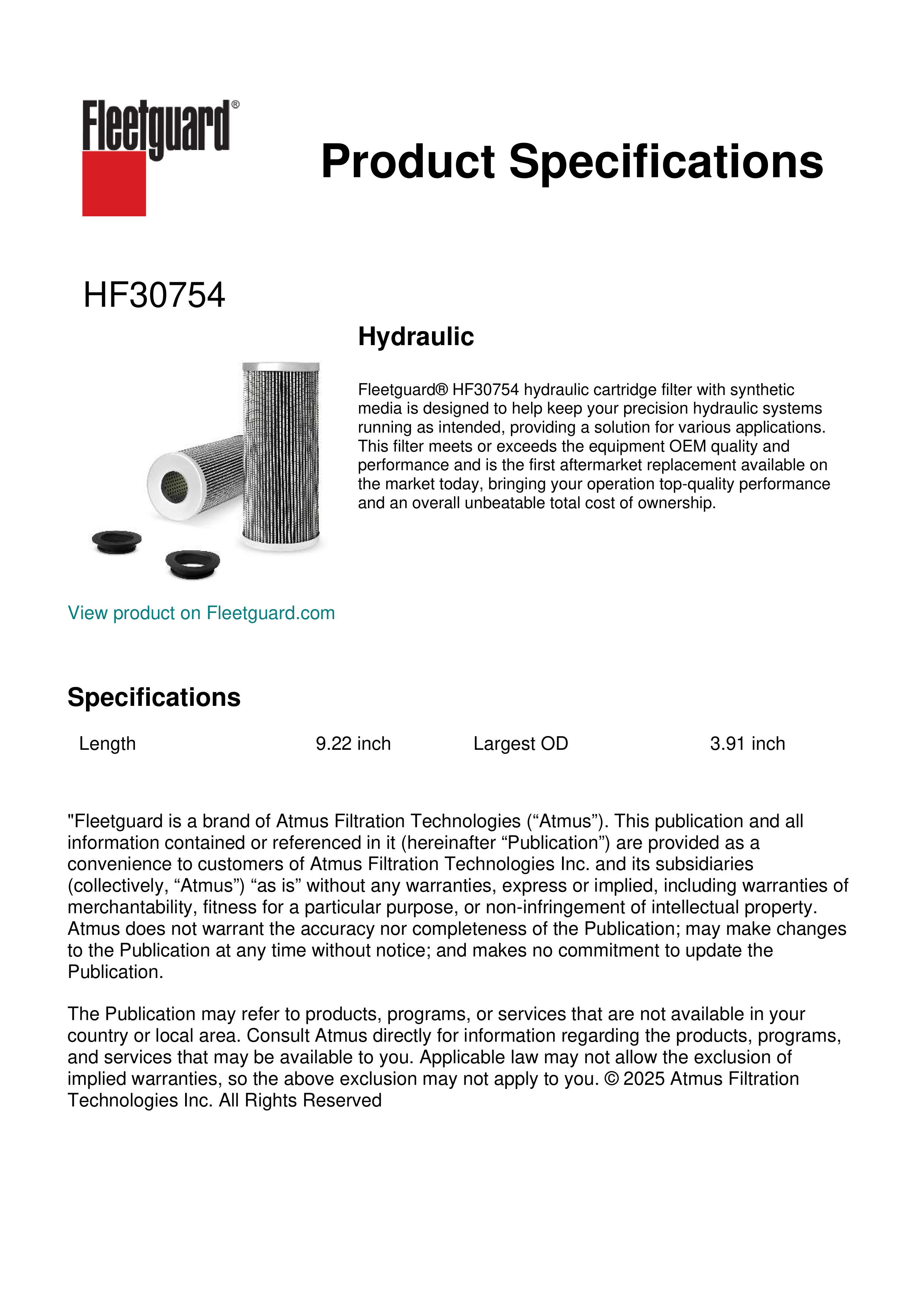 Fleetguard® HF30754 hydraulic cartridge filter with synthetic media is designed to help keep your precision hydraulic systems running as intended, providing a solution for various applications. This filter meets or exceeds the equipment OEM quality and performance and is the first aftermarket replacement available on the market today, bringing your operation top-quality performance and an overall unbeatable total cost of ownership.Specification