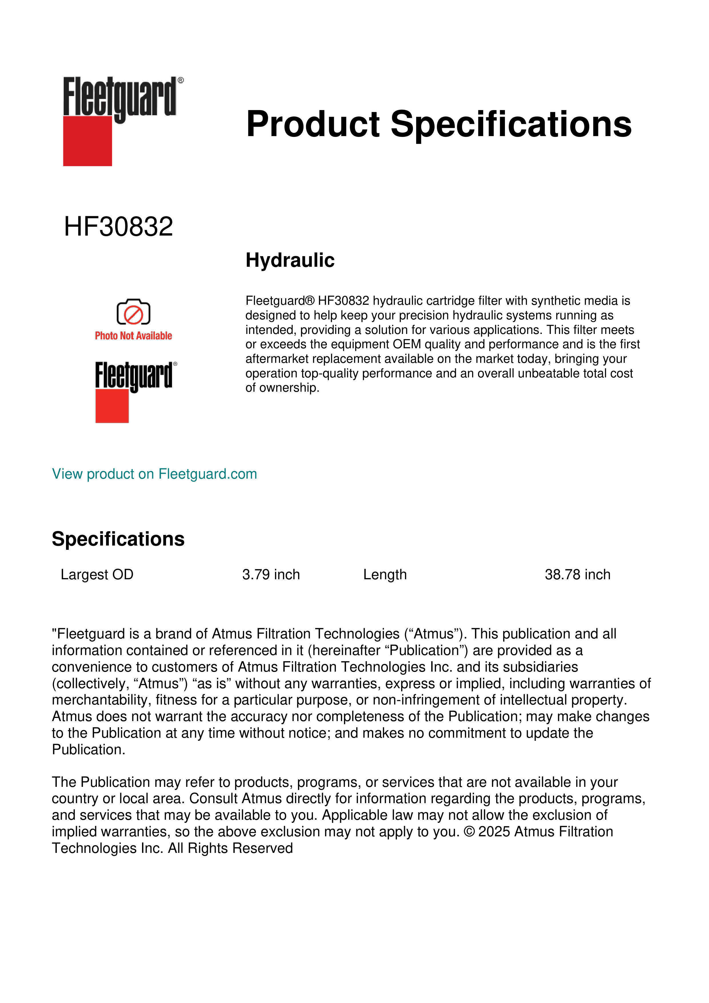 Fleetguard® HF30832 hydraulic cartridge filter with synthetic media is designed to help keep your precision hydraulic systems running as intended, providing a solution for various applications. This filter meets or exceeds the equipment OEM quality and performance and is the first aftermarket replacement available on the market today, bringing your operation top-quality performance and an overall unbeatable total cost of ownership.Specification