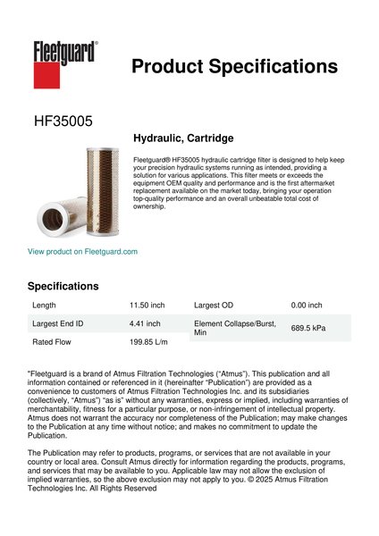Fleetguard® HF35005 hydraulic cartridge filter is designed to help keep your precision hydraulic systems running as intended, providing a solution for various applications. This filter meets or exceeds the equipment OEM quality and performance and is the first aftermarket replacement available on the market today, bringing your operation top-quality performance and an overall unbeatable total cost of ownership.