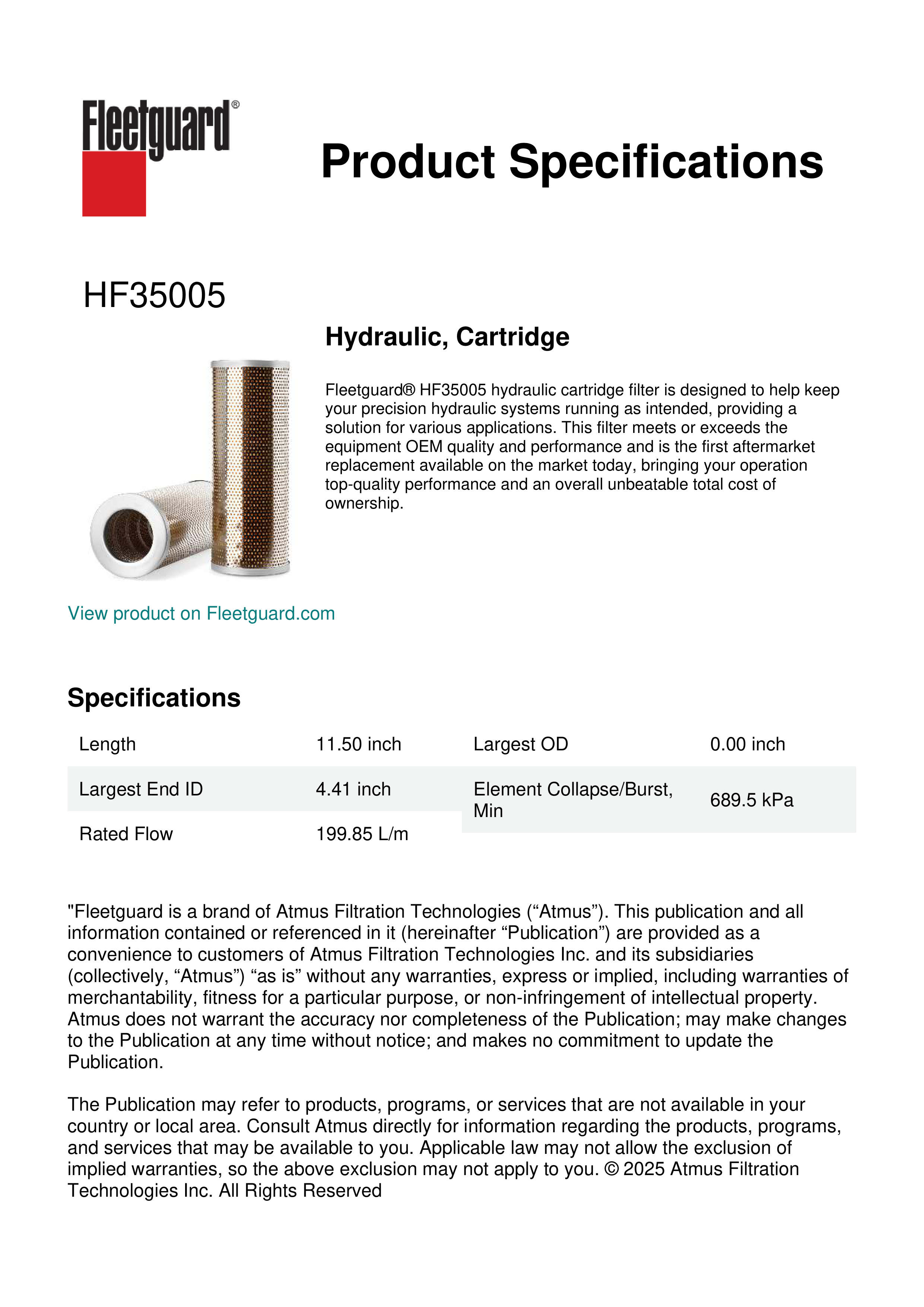 Fleetguard® HF35005 hydraulic cartridge filter is designed to help keep your precision hydraulic systems running as intended, providing a solution for various applications. This filter meets or exceeds the equipment OEM quality and performance and is the first aftermarket replacement available on the market today, bringing your operation top-quality performance and an overall unbeatable total cost of ownership.Specification