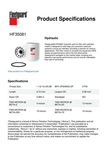 Fleetguard® HF35081 hydraulic spin-on filter with cellulose media is designed to help keep your precision hydraulic systems running as intended, providing a solution for various applications. This filter meets or exceeds the equipment OEM quality and performance and is the first aftermarket replacement available on the market today, bringing your operation top-quality performance and an overall unbeatable total cost of ownership.Specification