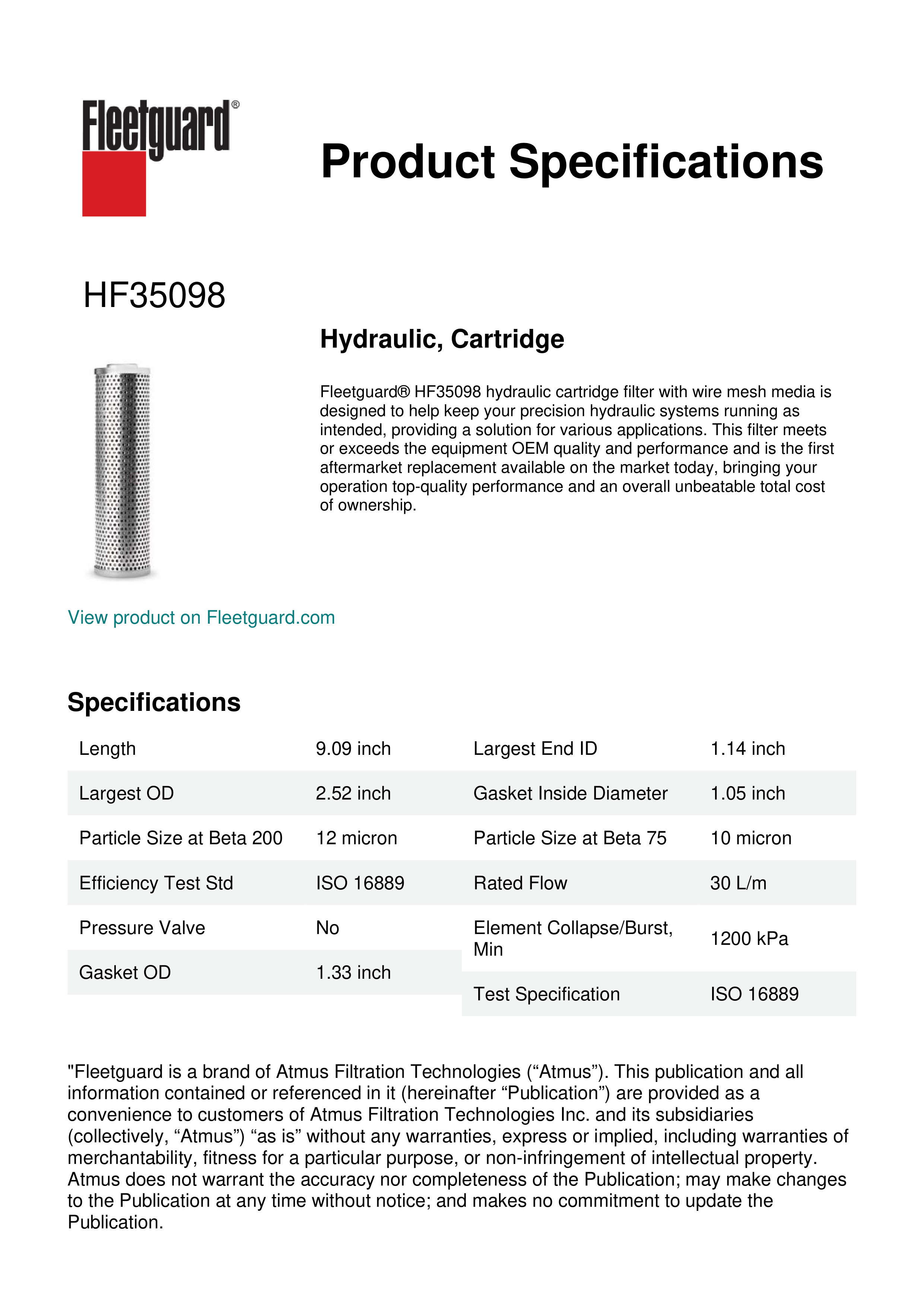 Fleetguard® HF35098 hydraulic cartridge filter with wire mesh media is designed to help keep your precision hydraulic systems running as intended, providing a solution for various applications. This filter meets or exceeds the equipment OEM quality and performance and is the first aftermarket replacement available on the market today, bringing your operation top-quality performance and an overall unbeatable total cost of ownership.Specification