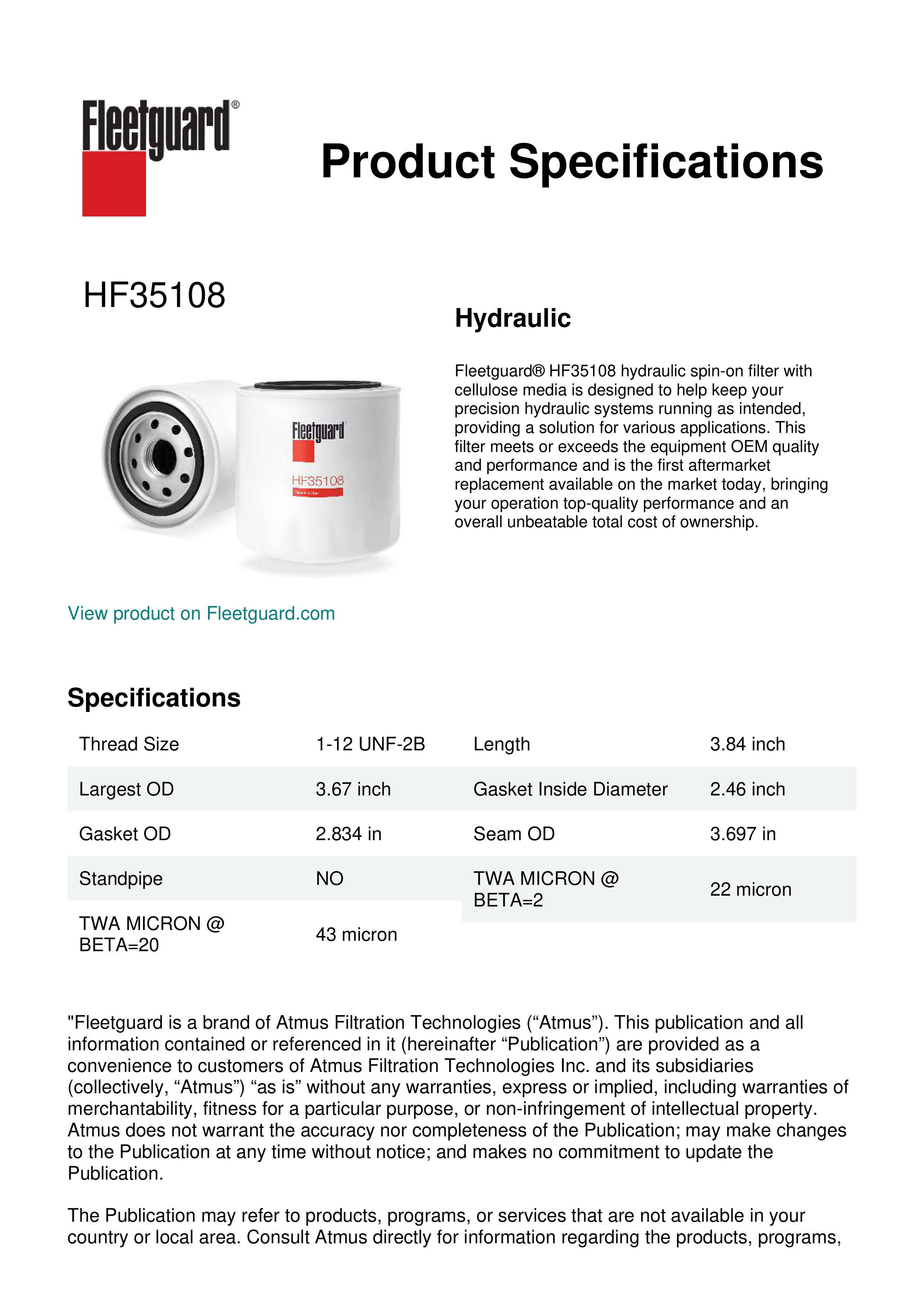 Fleetguard® HF35108 hydraulic spin-on filter with cellulose media is designed to help keep your precision hydraulic systems running as intended, providing a solution for various applications. This filter meets or exceeds the equipment OEM quality and performance and is the first aftermarket replacement available on the market today, bringing your operation top-quality performance and an overall unbeatable total cost of ownership.Specification