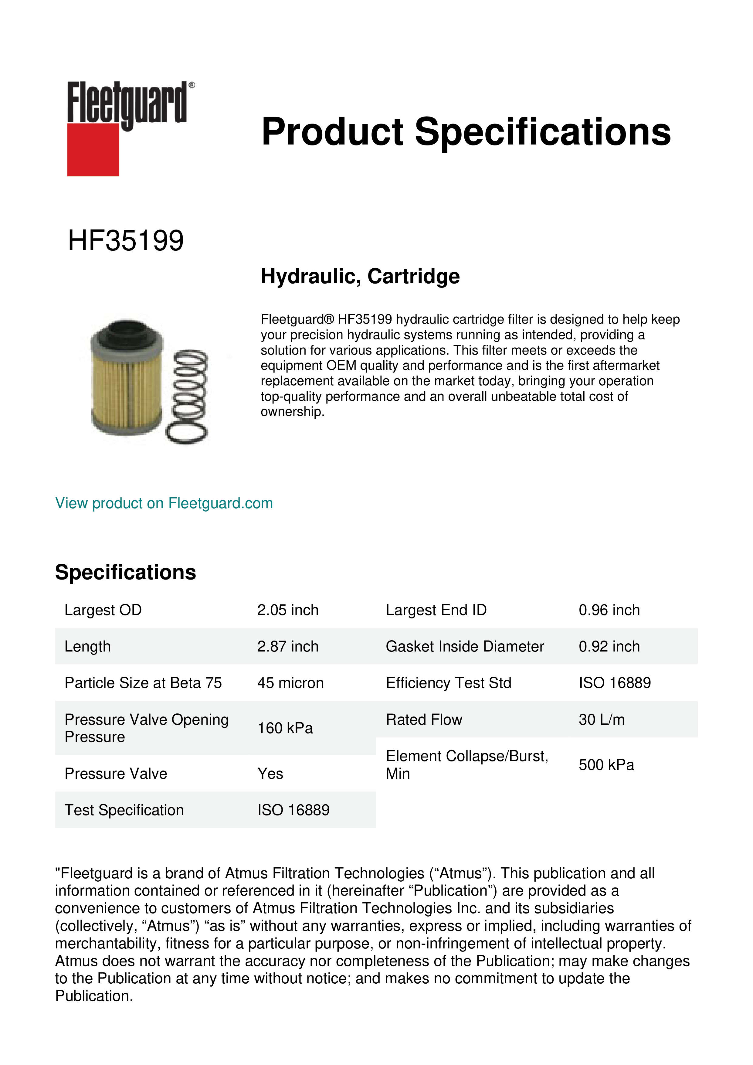 Fleetguard® HF35199 hydraulic cartridge filter is designed to help keep your precision hydraulic systems running as intended, providing a solution for various applications. This filter meets or exceeds the equipment OEM quality and performance and is the first aftermarket replacement available on the market today, bringing your operation top-quality performance and an overall unbeatable total cost of ownership.Specification
