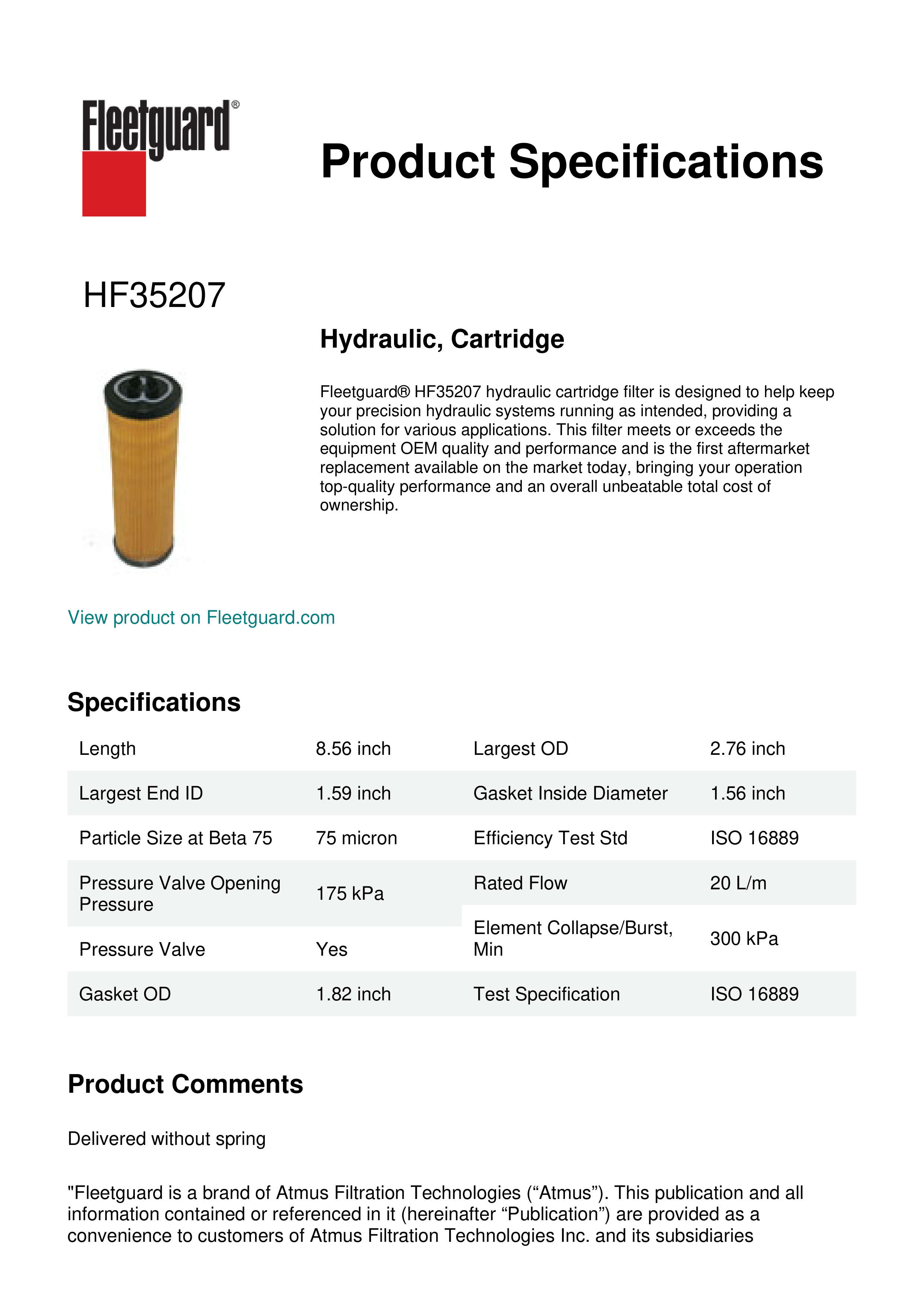 Fleetguard® HF35207 hydraulic cartridge filter is designed to help keep your precision hydraulic systems running as intended, providing a solution for various applications. This filter meets or exceeds the equipment OEM quality and performance and is the first aftermarket replacement available on the market today, bringing your operation top-quality performance and an overall unbeatable total cost of ownership.Specification
