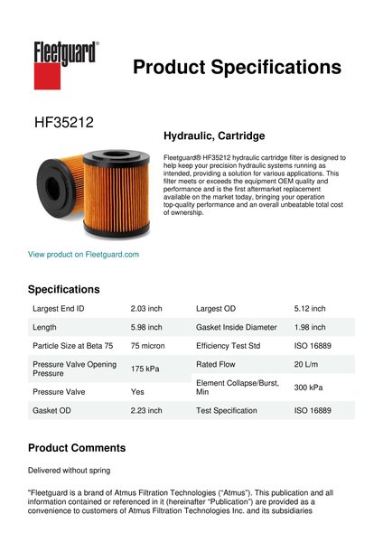 Fleetguard® HF35212 hydraulic cartridge filter is designed to help keep your precision hydraulic systems running as intended, providing a solution for various applications. This filter meets or exceeds the equipment OEM quality and performance and is the first aftermarket replacement available on the market today, bringing your operation top-quality performance and an overall unbeatable total cost of ownership.Specification