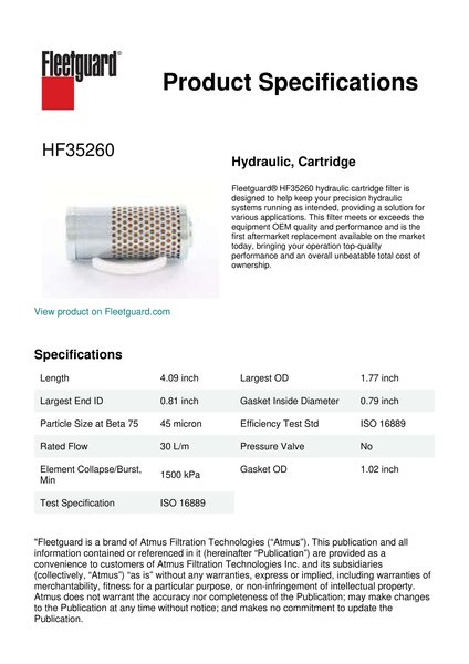 Fleetguard® HF35260 hydraulic cartridge filter is designed to help keep your precision hydraulic systems running as intended, providing a solution for various applications. This filter meets or exceeds the equipment OEM quality and performance and is the first aftermarket replacement available on the market today, bringing your operation top-quality performance and an overall unbeatable total cost of ownership.Specification