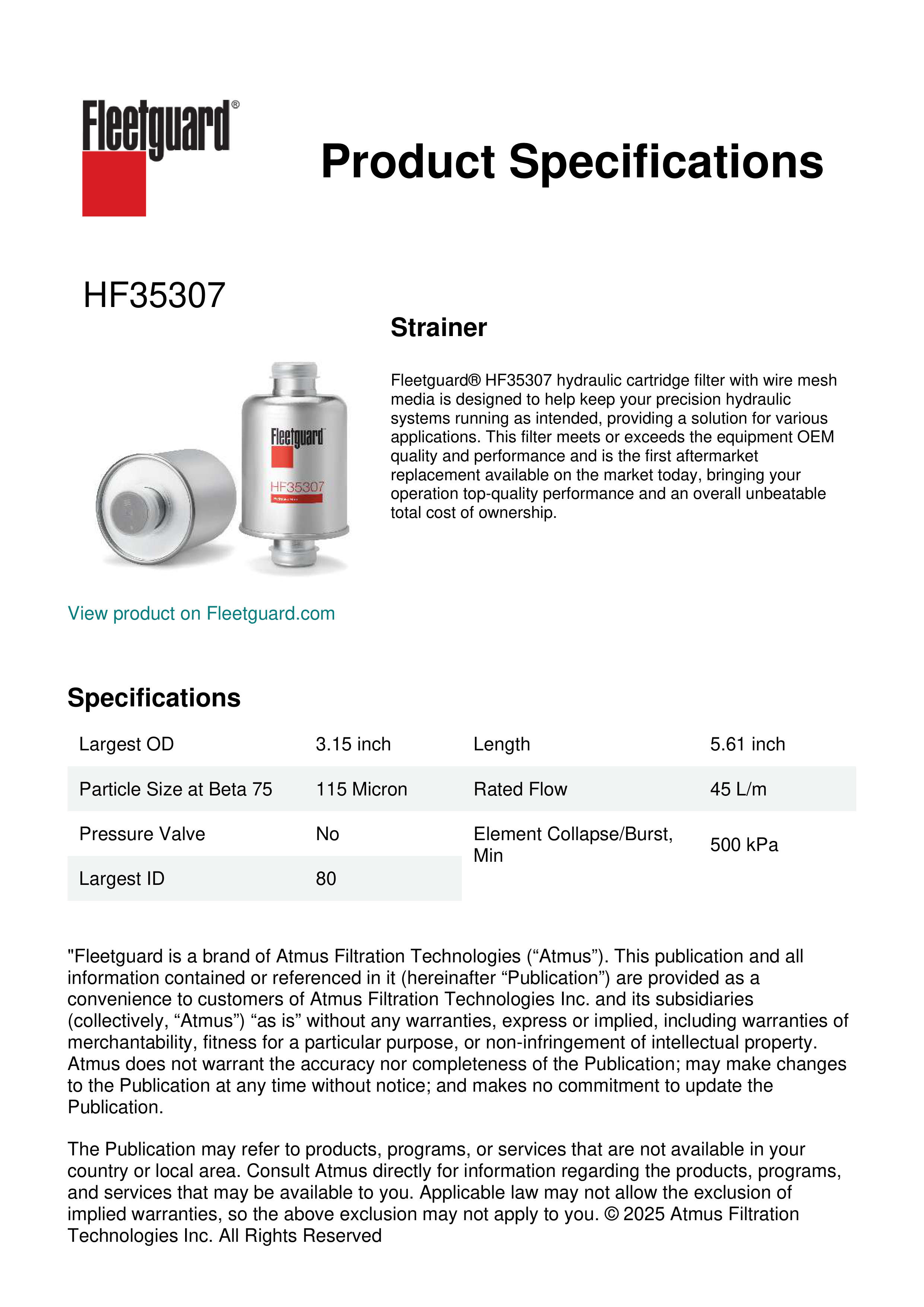 Fleetguard® HF35307 hydraulic cartridge filter with wire mesh media is designed to help keep your precision hydraulic systems running as intended, providing a solution for various applications. This filter meets or exceeds the equipment OEM quality and performance and is the first aftermarket replacement available on the market today, bringing your operation top-quality performance and an overall unbeatable total cost of ownership.Specification