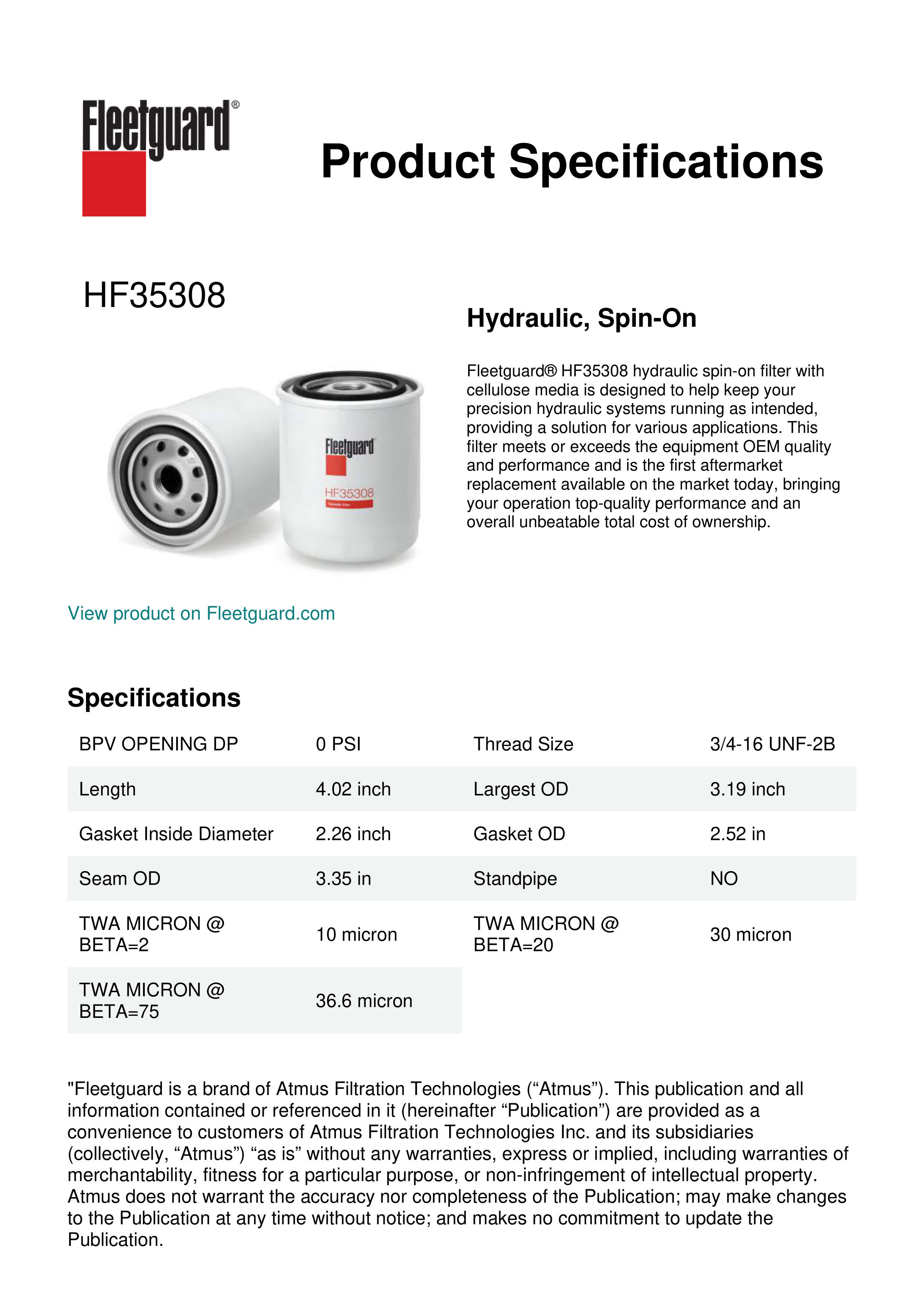 Fleetguard® HF35308 hydraulic spin-on filter with cellulose media is designed to help keep your precision hydraulic systems running as intended, providing a solution for various applications. This filter meets or exceeds the equipment OEM quality and performance and is the first aftermarket replacement available on the market today, bringing your operation top-quality performance and an overall unbeatable total cost of ownership.Specification